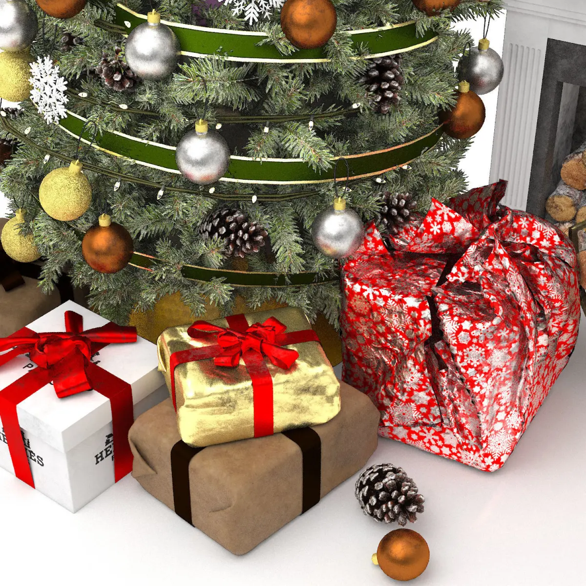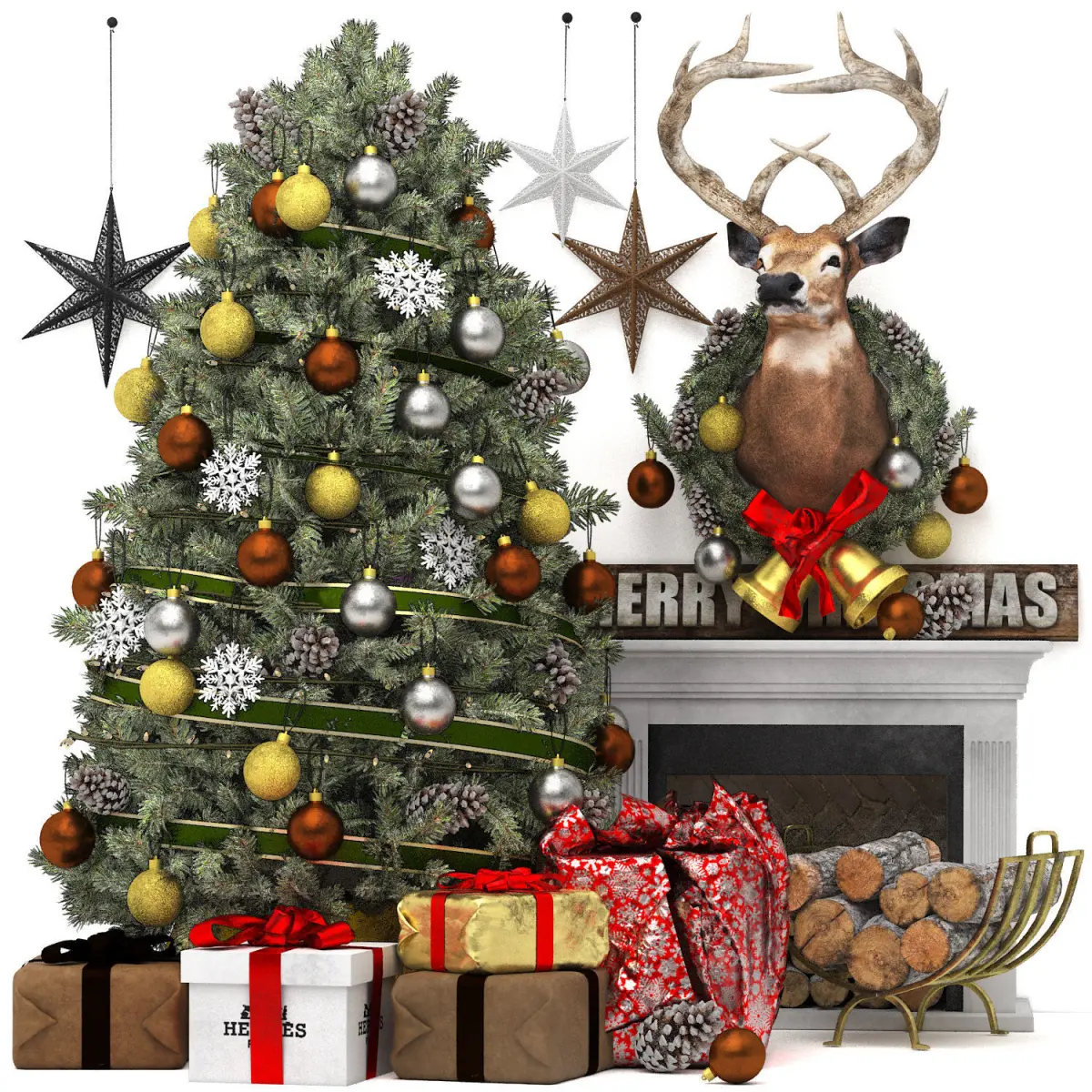 christmas tree with fireplacedescription FORMATPlatform: 3dsMax 2015 + obj,Render: Vray+ corona size: 109 MBpolys : 1 452 100verts : 1 508 228Dimensionsx : 276,935 cmy : 210, 726 cmz : 260, 909 cm