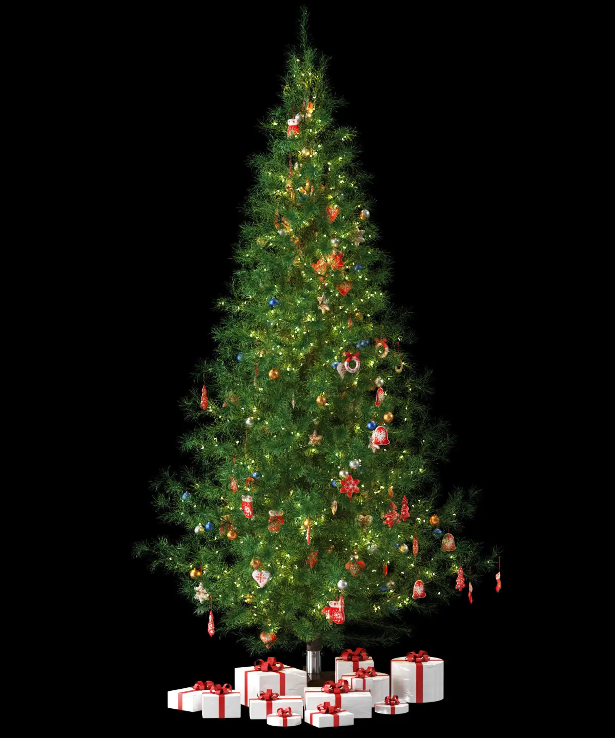 Christmas tree with gifts toys, balls and garlands.