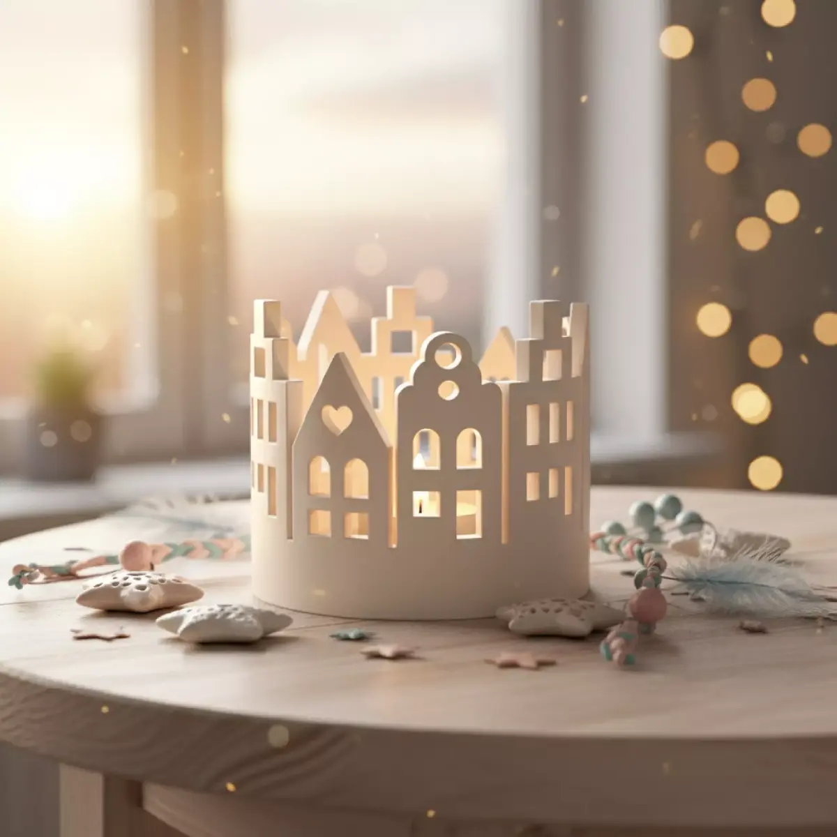 This digital download features a beautifully detailed candle holder STL file shaped like a cozy winter village, complete with heart windows and intricate rooftops. Perfect for use with LED tea lights, it casts a soft, enchanting light through its tiny windows, evoking the comforting spirit of snow-covered streets and festive evenings. Ideal as a Christmas table centerpiece, mantle decoration, or part of a holiday village display, this design blends Scandinavian minimalism with timeless holiday warmth. Printed in white, metallic, or pastel tones, it becomes a cozy highlight of any festive home.