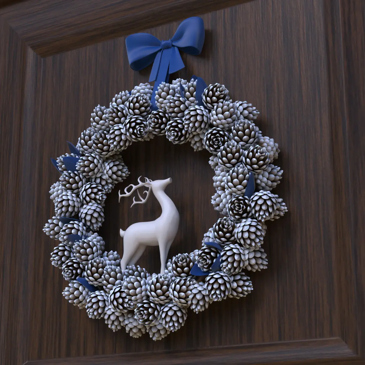 High resolution Christmas wreath;the model uses the following textures:1 1024x1024 diffuse map and 1 1024x1024 displacement map (wreath); 1 1024x1024 diffuse map (wooden plaque).The pine cones are all instanced, so although the polygon count is high, the scene is very light.The presentation images are rendered using the V-Ray version (HDRI is included).