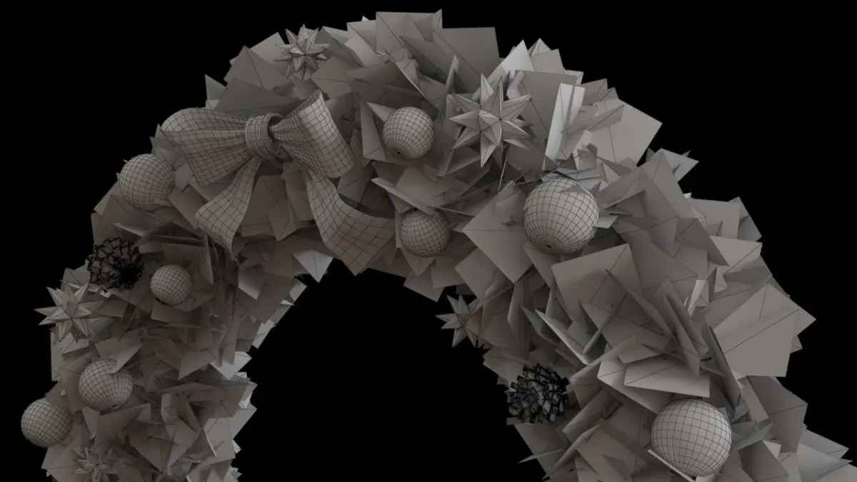- Pine material created with bump and opacity maps on flat planes to create the wreath