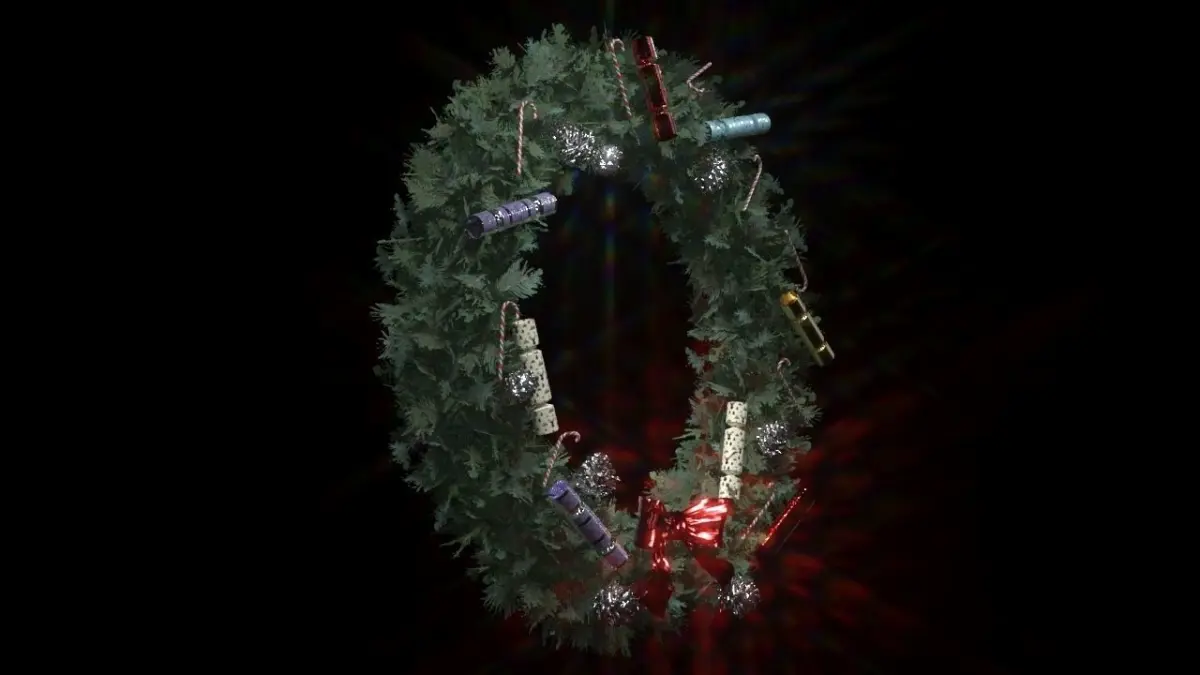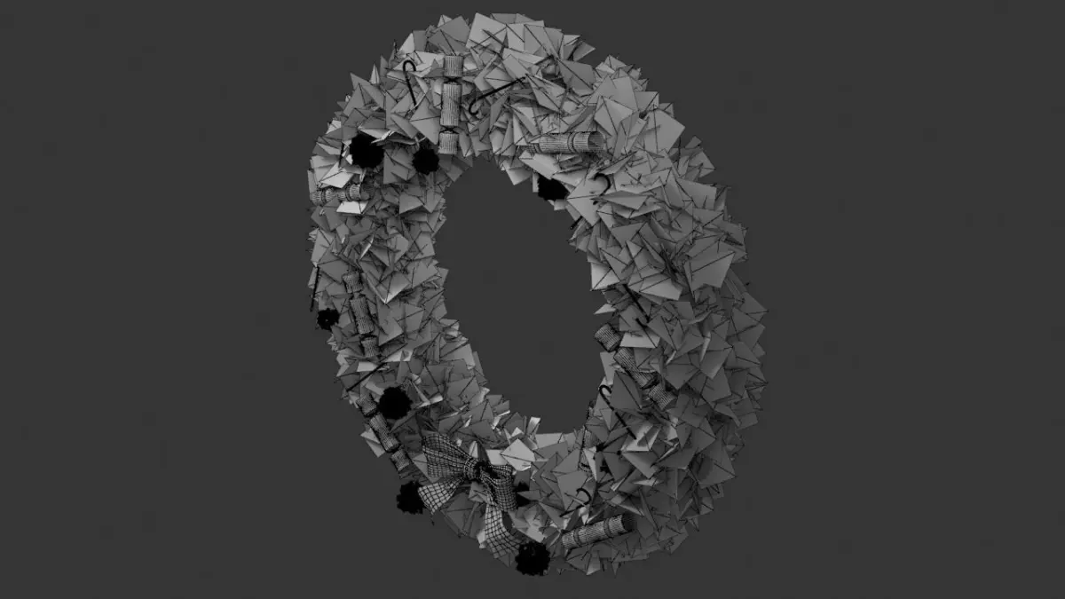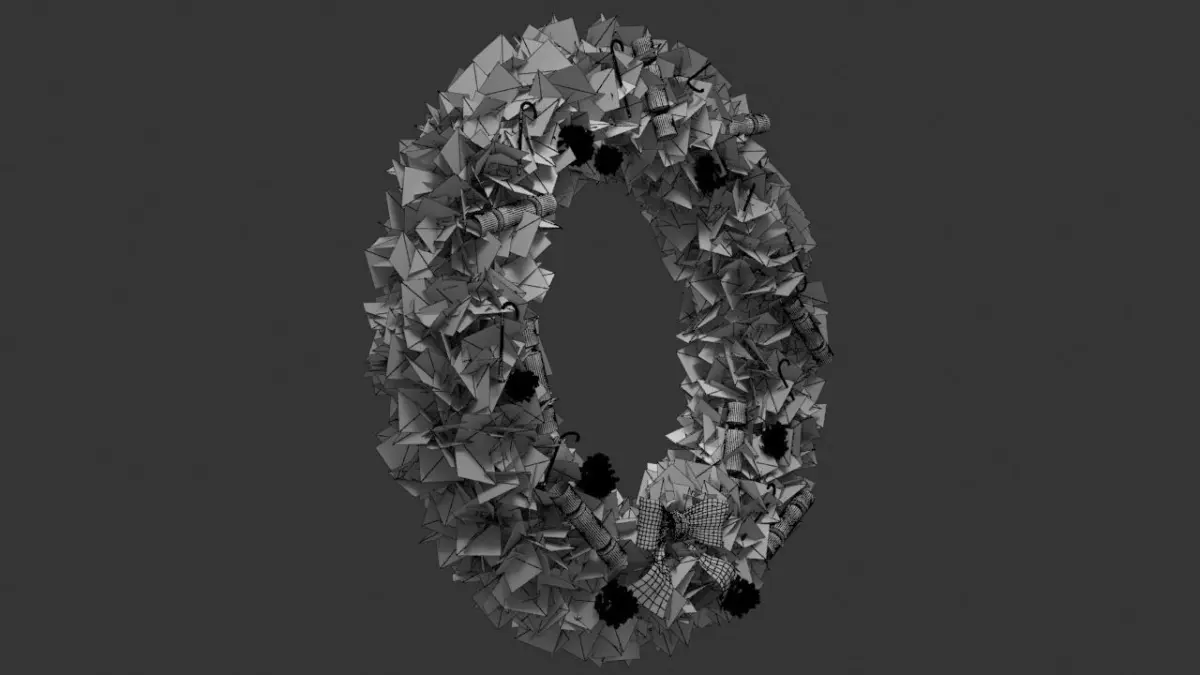 - Pine material created with bump and opacity maps on flat planes to create the wreath