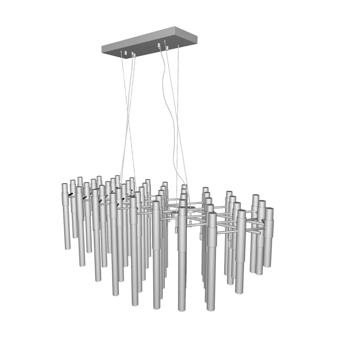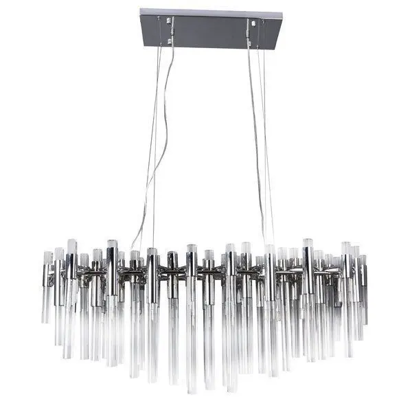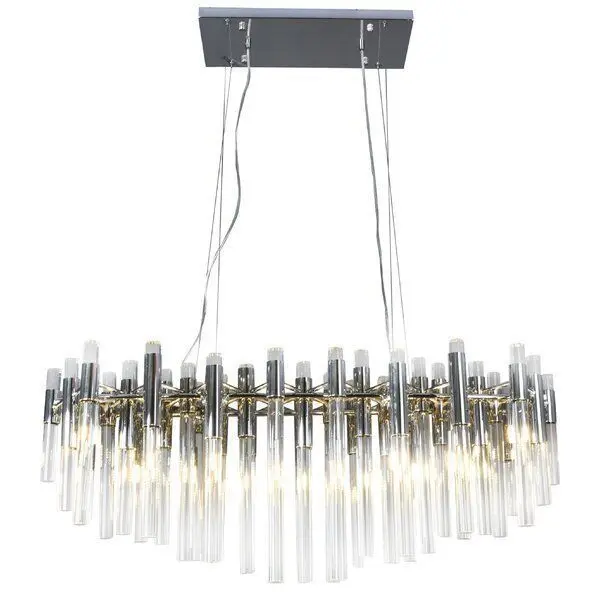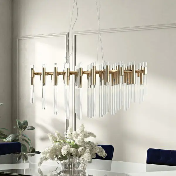 - A metal framed chandelier that comes in either a gold or chrome finish. There are clear crystal rods that hang throughout, which create a beautiful sparkle when illuminated.