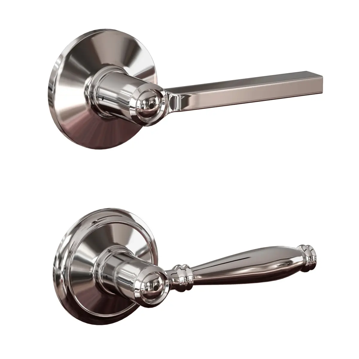 Detailed 3d model - a set of door handles of different shapes (4 types), as well as a door lock with a key and a latch. The material of the handles is chrome-plated metal. The model is made for smoothing, if desired, you can apply the TurboSmooth modifier for closer angles.