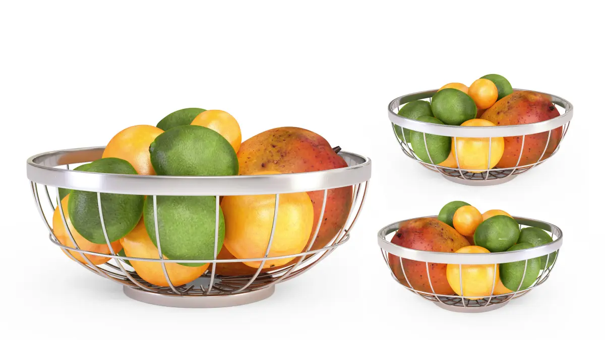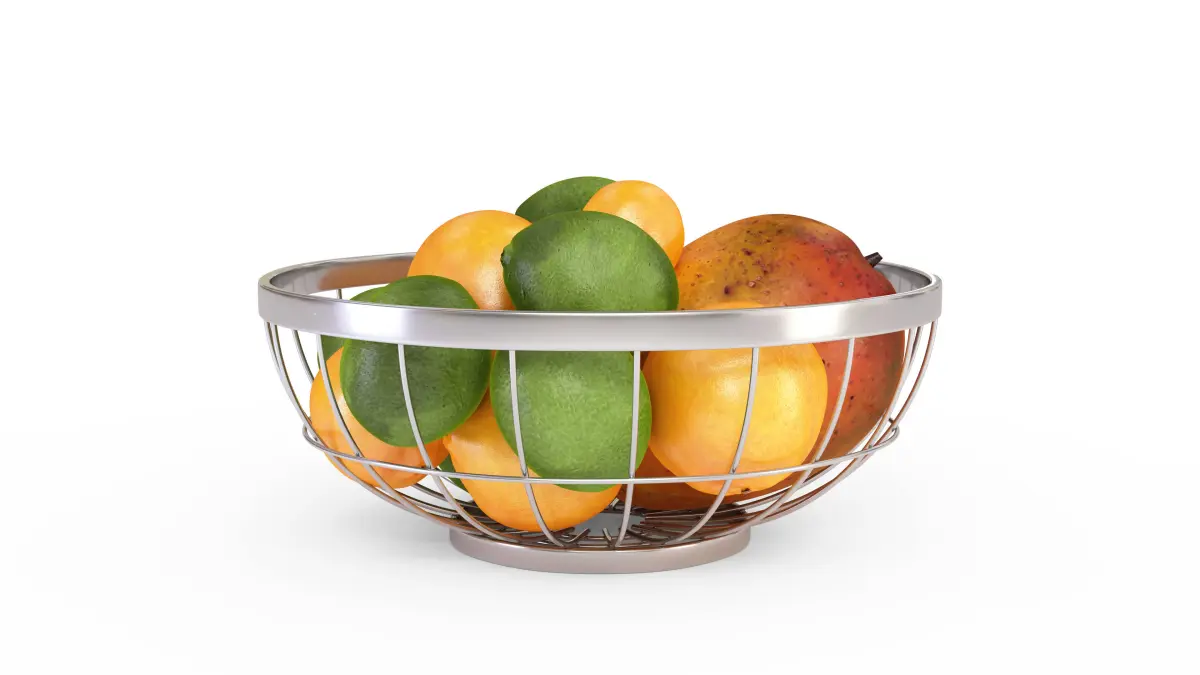 Chrome Wire Grid Fruit Basket with Fruits (With Oranges, Limes and Mangos)
