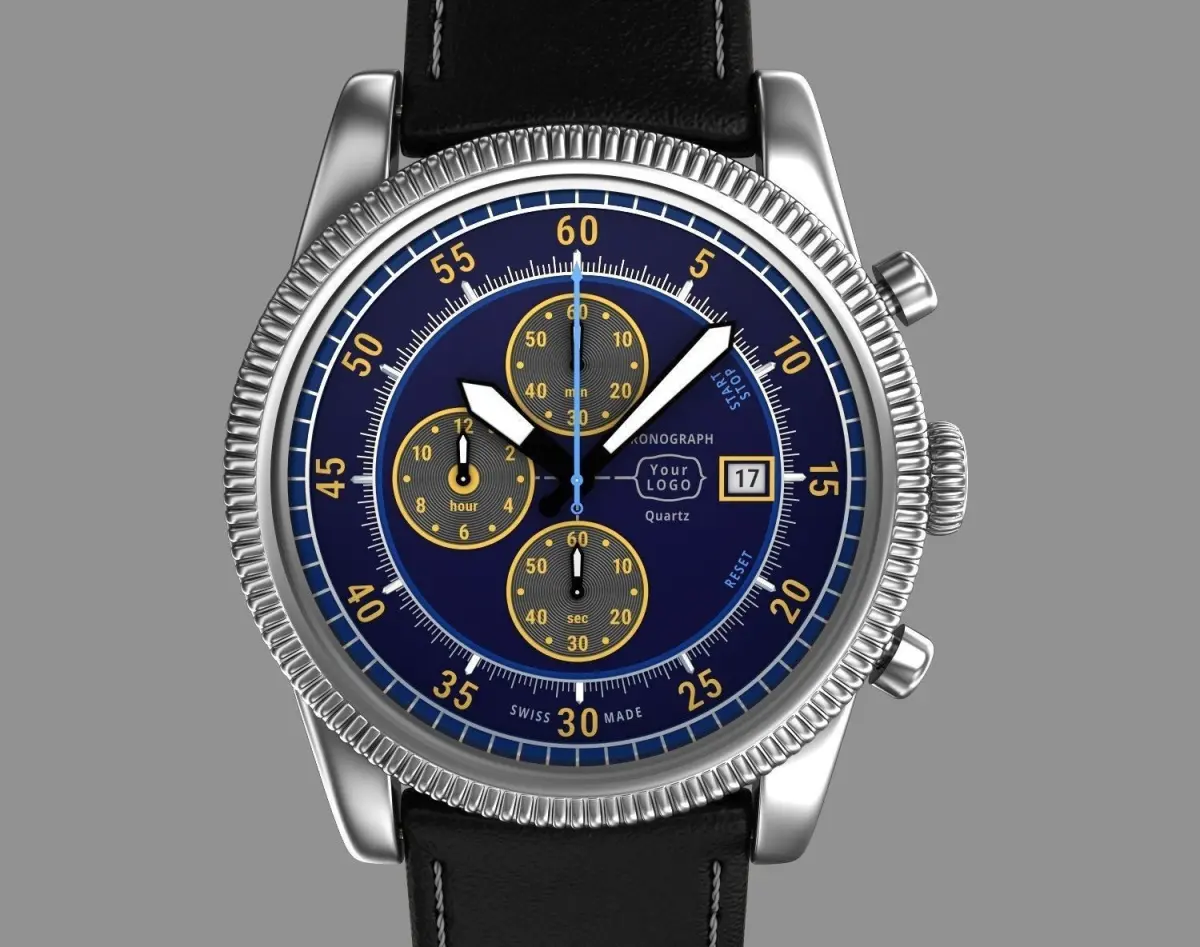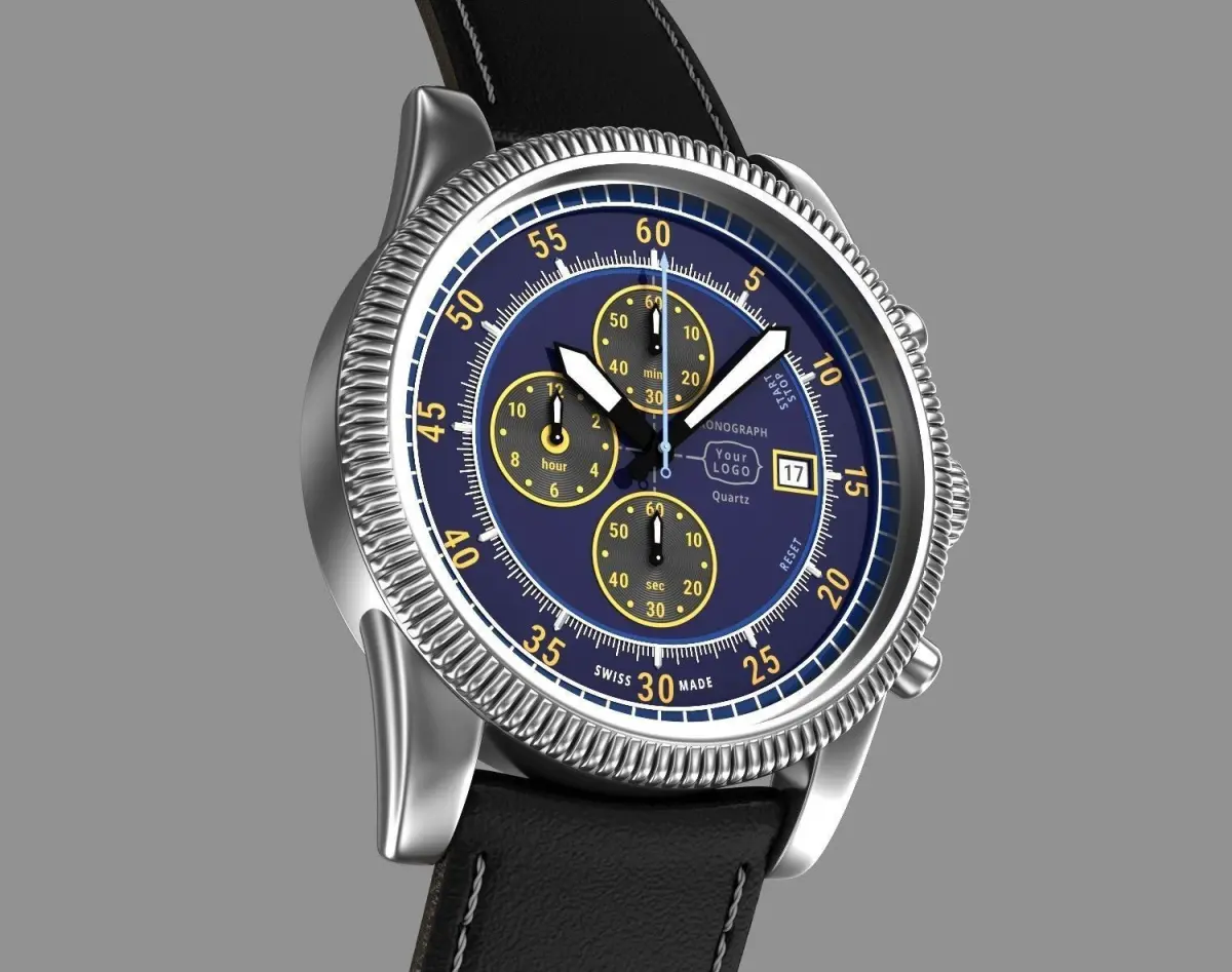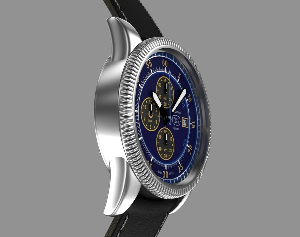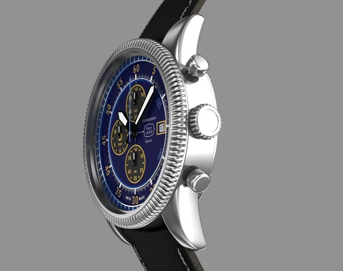 Chronograph wrist watch, chronograph. My own design. No existing brands used. Can be produced.Hi-Poly 3d model of modern pilot men's watch with leather strap and classic clasp.In this watch was used Miyota 0s10 quartz movement , but you can put another movement as you want. Where is enough free space inside to insert bigger size movement.Free space inside case - Diametr : 34 mm x Height : 5,5 mm