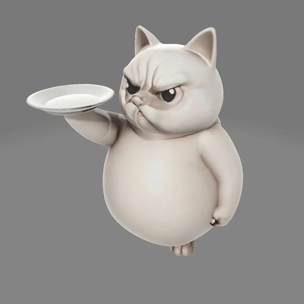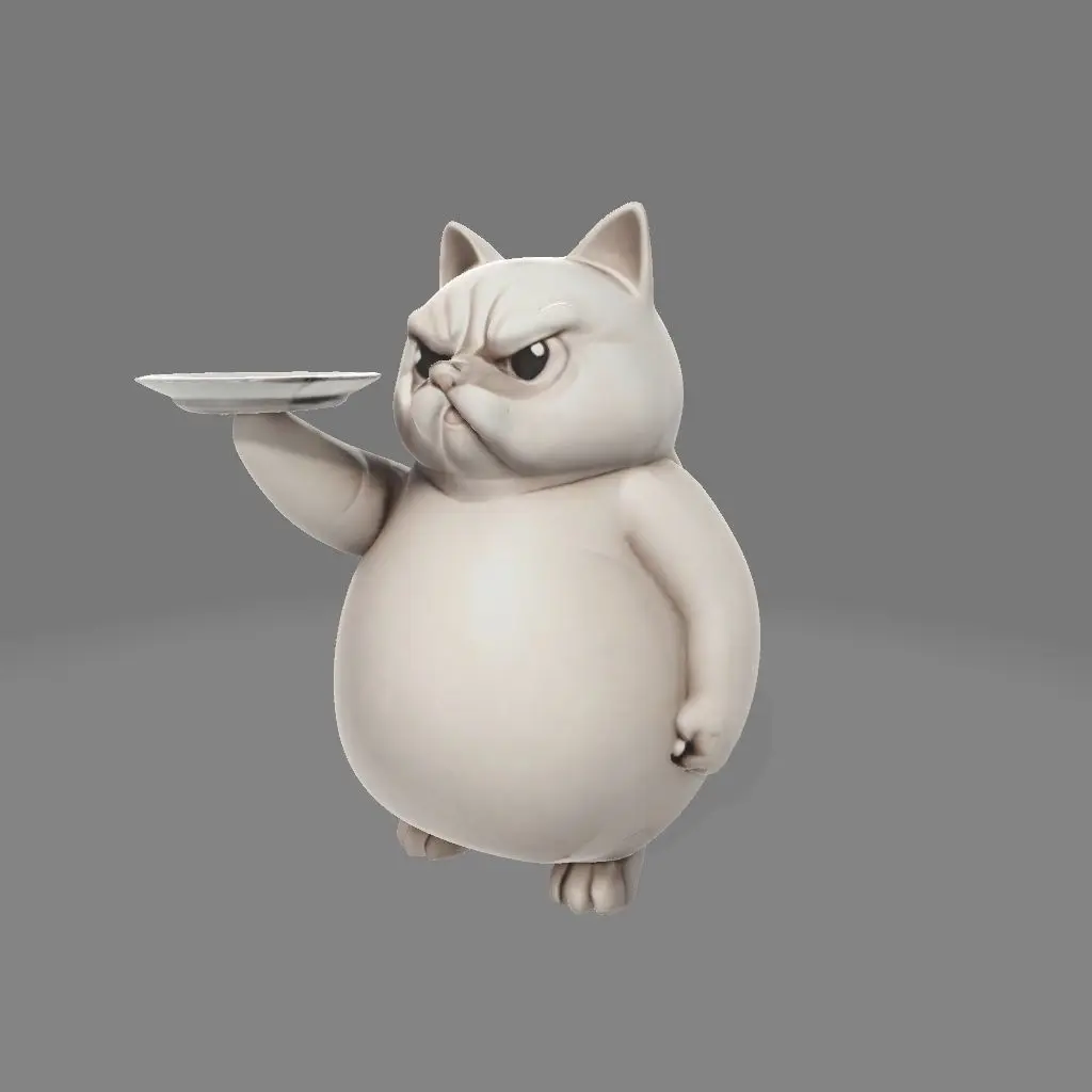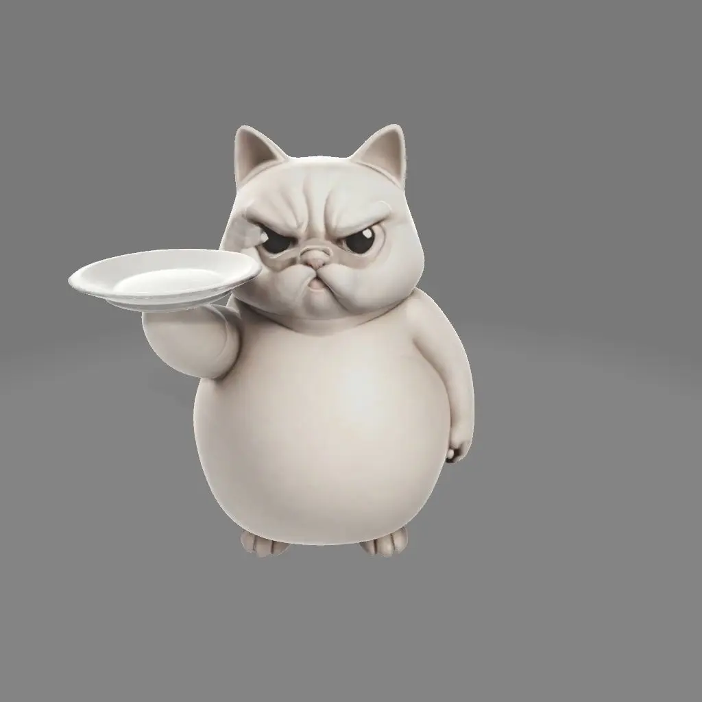 3D printed sculpture of a chubby, funny cat standing with a raised plate in its paw, demanding attention. The design features exaggerated, rounded proportions, furrowed brows, and a pouty expression, capturing its comically impatient character. Smooth, plump curves enhance its playful yet feisty demeanor, making it a charming and humorous addition to any space.i hope you would love this cat stuff =)