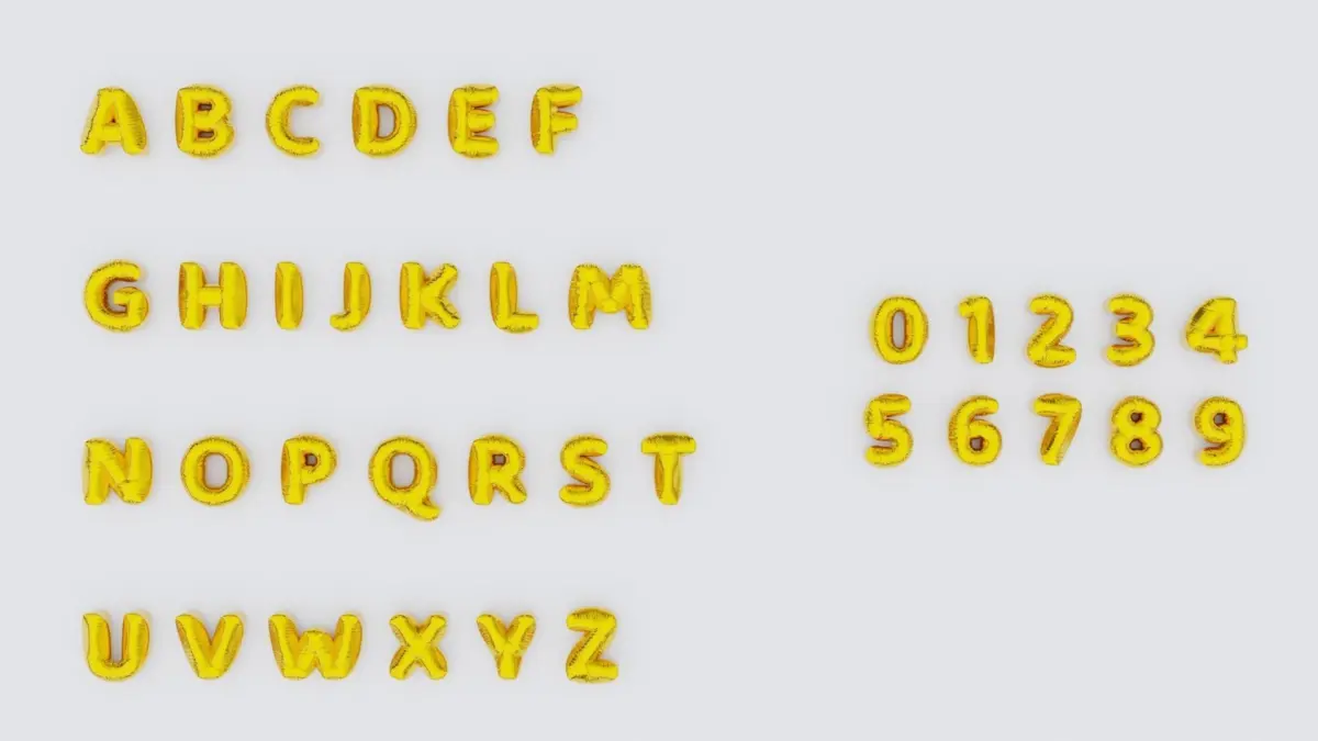 A collection of inflated Alphabet Chubby Balloons, with Golden glossy Foil material for 26 Alphabets and 10 Numbers (Total 36 Characters),they could be used for Indoor and outdoor decorations, parties, celebrations or even advertisements,the mesh Inflation size and topology gives a feeling of pressured air or helium inside the Balloon,