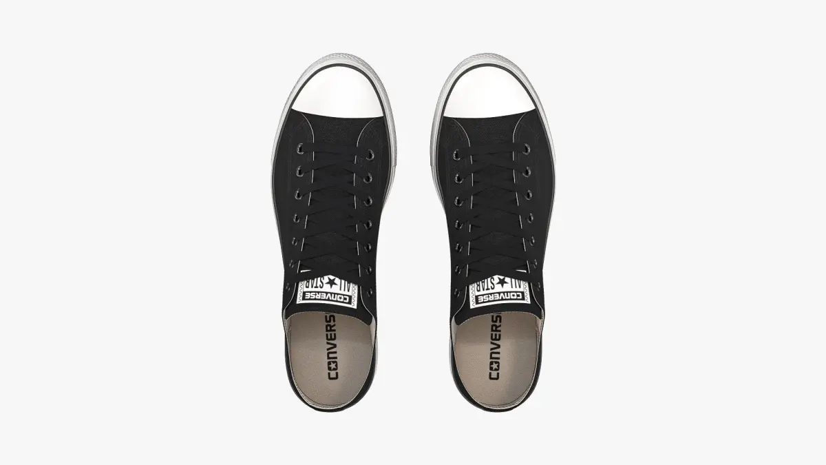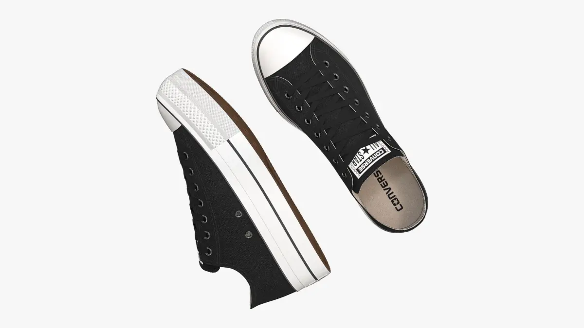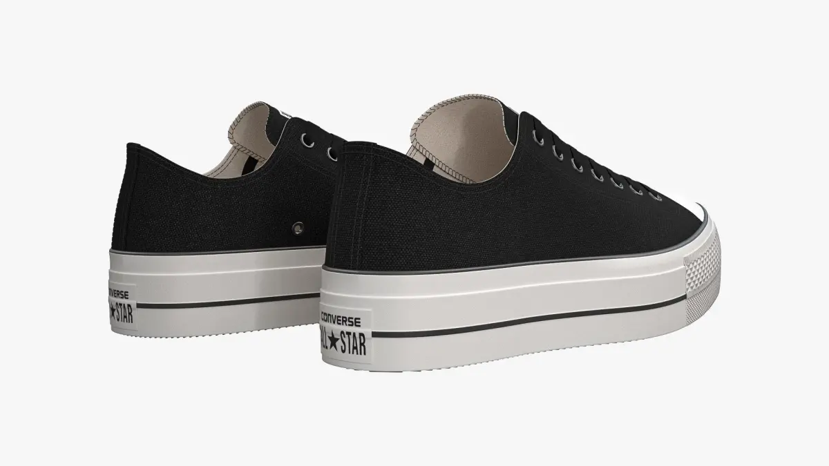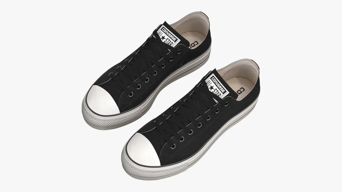 Detailed 3D model of a pair of Black Chuck Taylor All Star Lift Platform Low Top sneakers, modeled in Cinema 4D and rendered with V-Ray 5. The model was created using approximate real world dimensions.