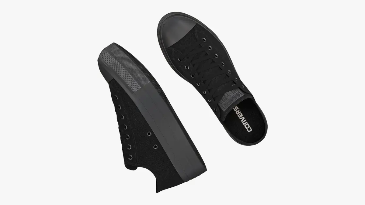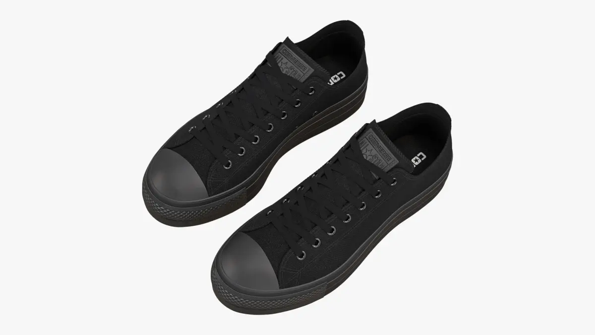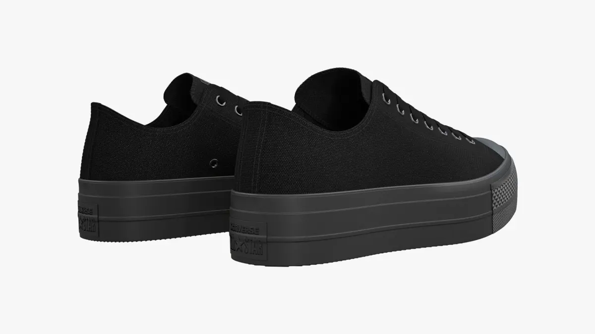 Detailed 3D model of a pair of Monochrome Black Chuck Taylor All Star Lift Platform Low Top sneakers, modeled in Cinema 4D and rendered with V-Ray 5. The model was created using approximate real world dimensions.