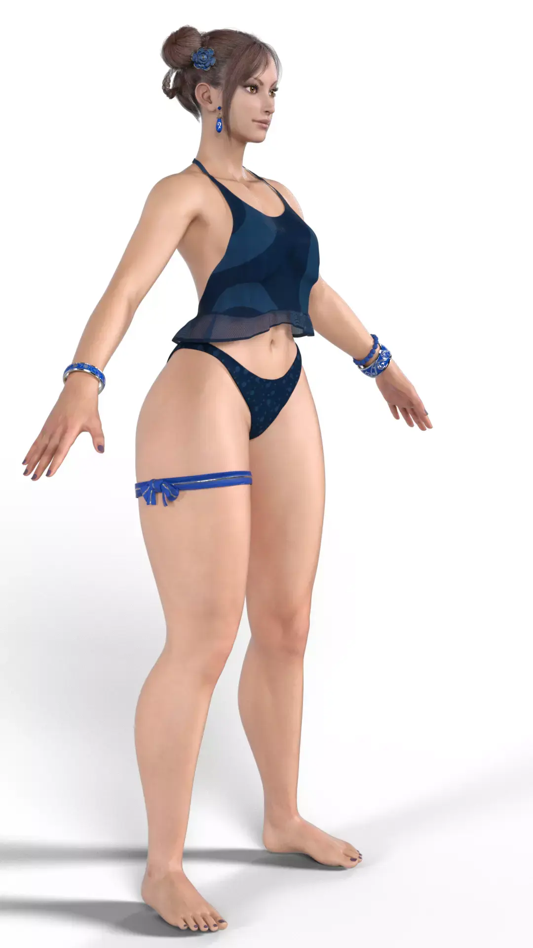 Bring the strongest woman in the world to the beach with this highly detailed 3D model of Chun-Li, the iconic fighter from the Street Fighter series. This asset features Chun-Li in a modern, realistic summer outfit, moving away from her traditional Qipao while retaining her recognizable features.