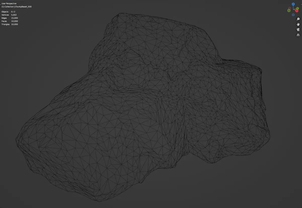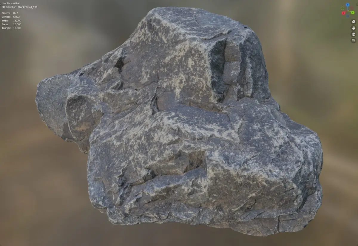 Photorealistic chunky basalt made from Photogrammetry. 8K Texture Files : Color, Normal, and Ambient Occlusion. Model origins are centered by mass. Models are provied as FBX and OBJ for maximum interoperability with 3d programs and game engines. LODs are available with the following face counts: 500, 1K, 5K, 10K, 200k, 2Mil, 16Mil