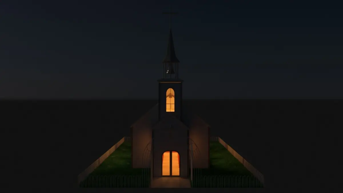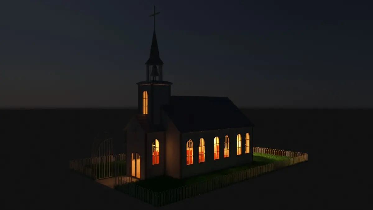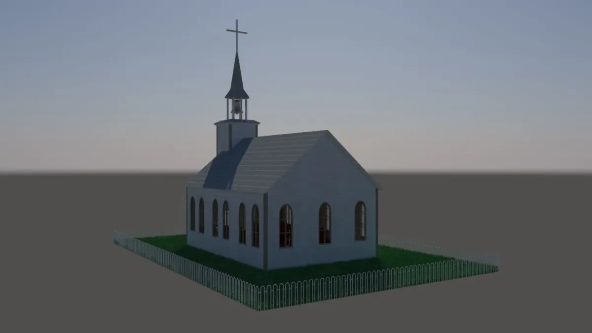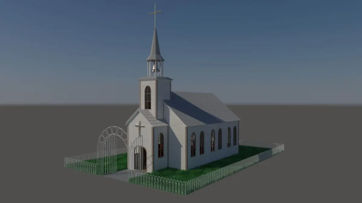 A old traditional style wooden village church with spire and brass church bell. Surrounded with a low metal frame picket style fence and large gates and decorative gate arch.The interior of the church has a patterned wood floor and oak church pews and stage.Gold candle stick holders decorate the pews and bring a nice light and finish the the inside of this model.