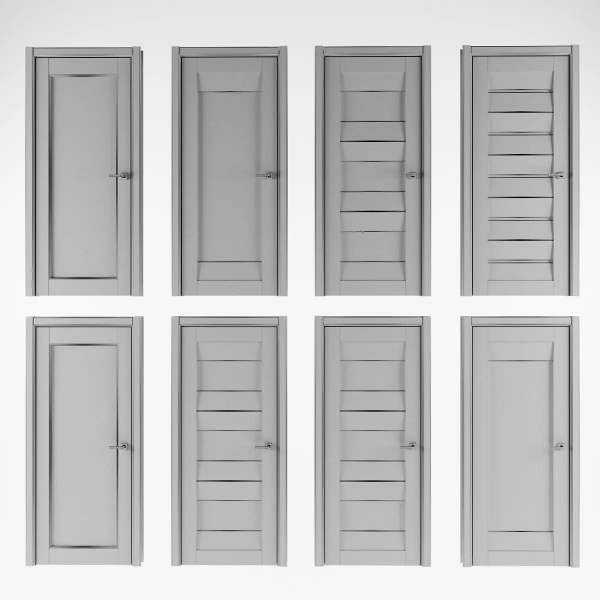collection of Domberg doors in a modern style with different types of panels and sandblasted glass inserts