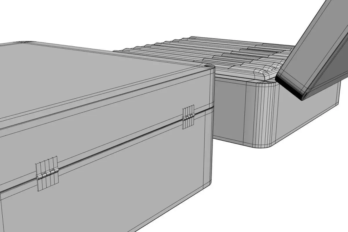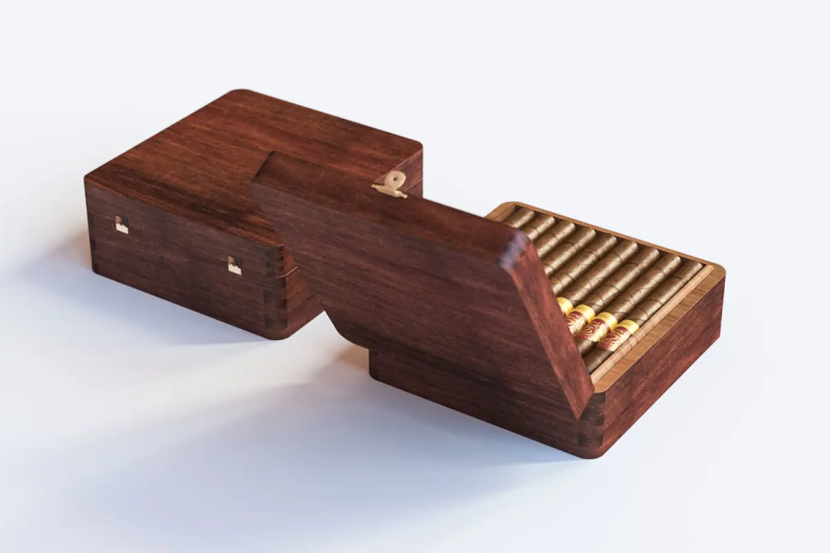 The high quality 3D model includes cigar box in classic wooden packaging closed with a metal latch. Cigars stacked side by side inside.