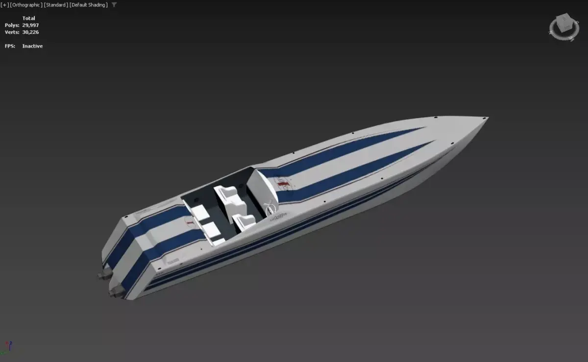Open cockpit with bolster seats, central helm station, and detailed dashboardTwin stern-mounted outboard engines for realistic high-power performanceSignature Cigarette branding and racing-inspired graphicsAerodynamic deck layout with flush hatches and minimalistic luxury touchesClean geometry optimized for both close-up renders and real-time use