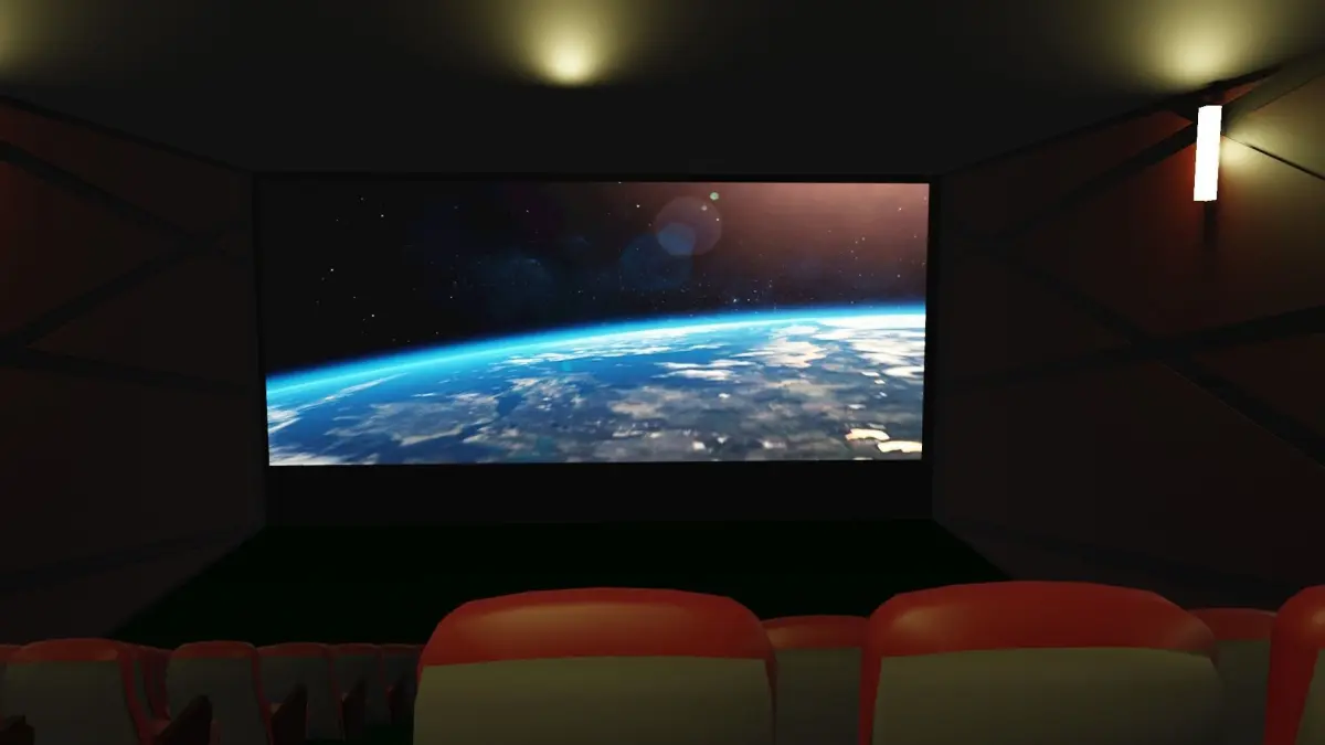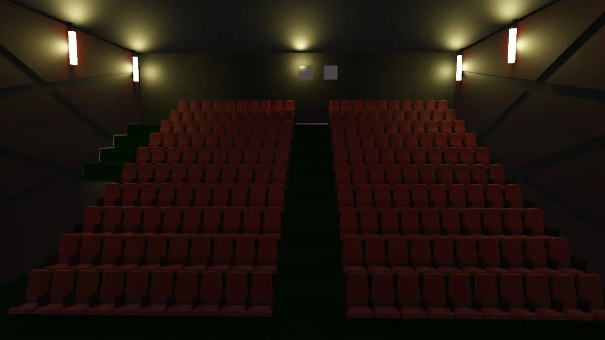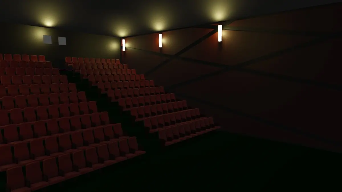 3D model of a screen in multiplex with 200 seats, entrance, narrow corridor, then entering the cinema, screen, seats, interior lighting and wall claddingwithout projector room model.