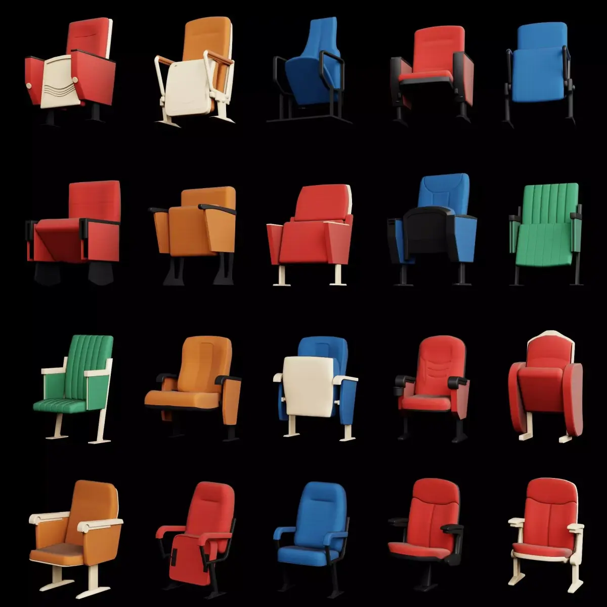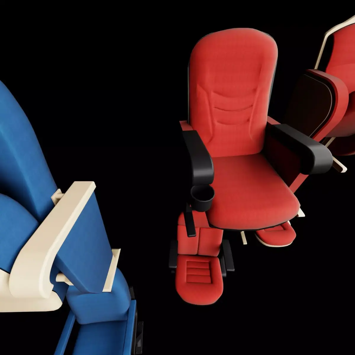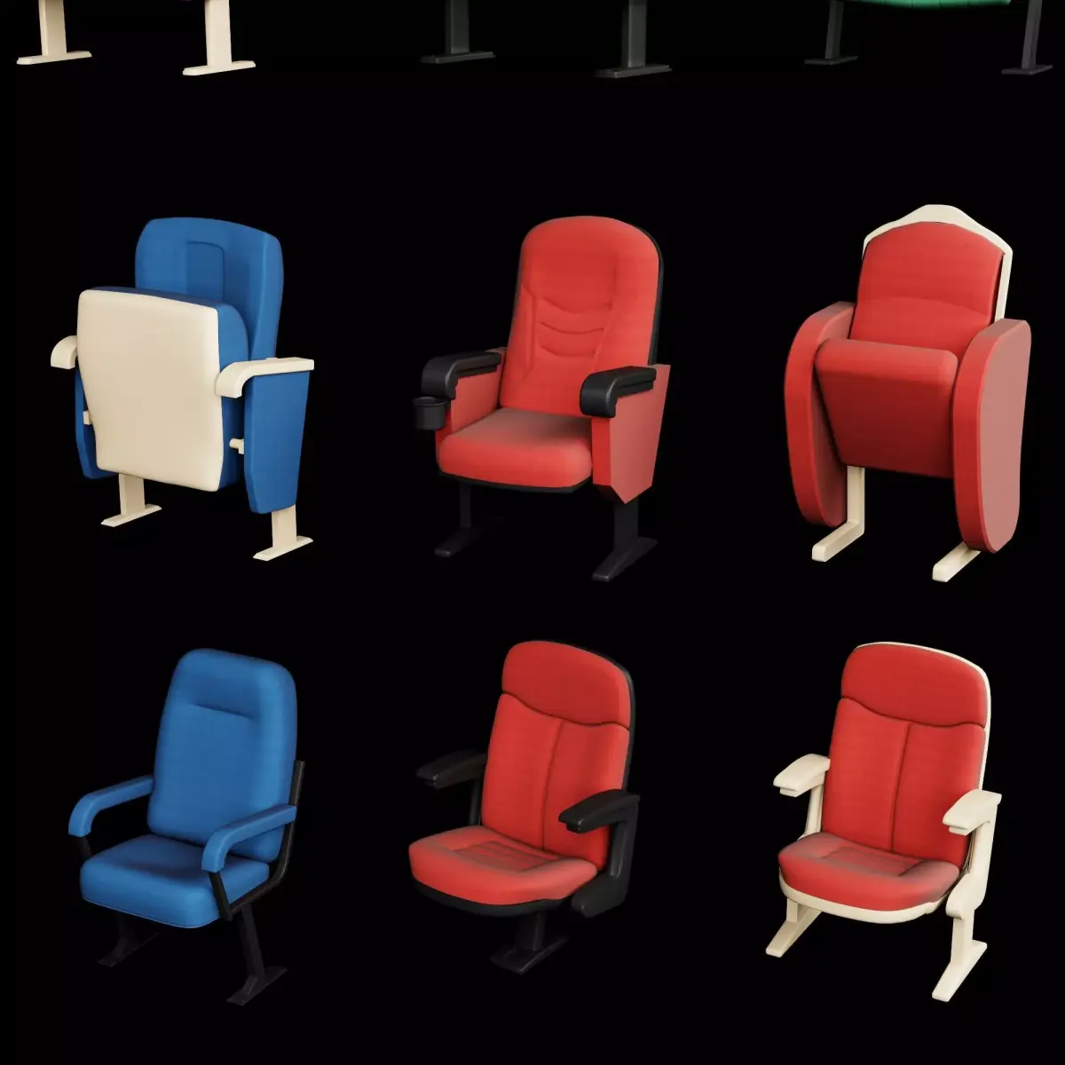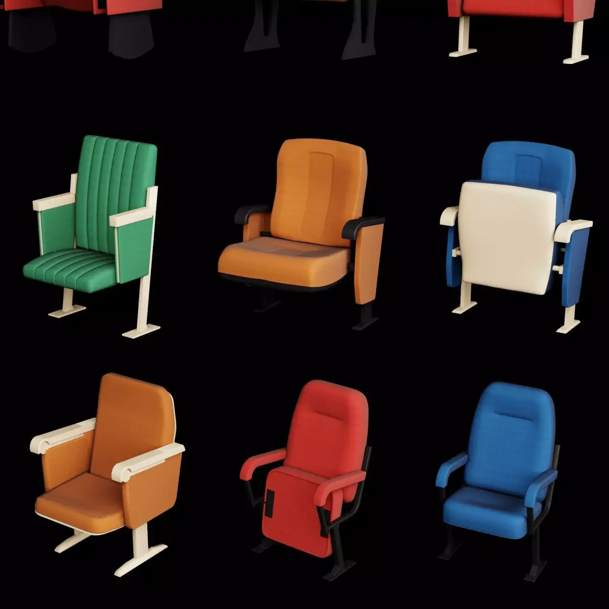 High-quality pack of cinema and theater seating chairs 3D models, featuring: reclining auditorium seats in multiple colors (red, blue, gray, beige, orange accents), padded armrests with cup holders, metal/wood base frames, fabric/leather upholstery variations, tiered row compatibility, and detailed entertainment venue seating props.Models built to real-world scale with high detail — realistic fabric/leather stitching and creases, metal polish/reflections, ergonomic shaping, subtle wear on high-touch areas, and authentic modern cinema/theater seating realism.Full PBR workflow with high-res textures (2K-4K): Albedo, Roughness, Metallic, Normal, AO maps for realistic upholstery softness, metal shine, fabric texture, and depth in any lighting.Ideal for:• Architectural visualization and cinema/theater renders• Auditorium, movie hall, and entertainment seating builds• Public venue and screening room simulation scenes• Game assets (Unity/Unreal ready)• VR/AR virtual theater and viewing experiences• VFX, promotional videos, interior designOptimized polycount for real-time — drag and drop to enhance scenes instantly.Compatible formats:MAX (with materials), OBJ, FBXCompatible with 3ds Max, Maya, Blender, Cinema 4D, Unity, Unreal Engine, and more.