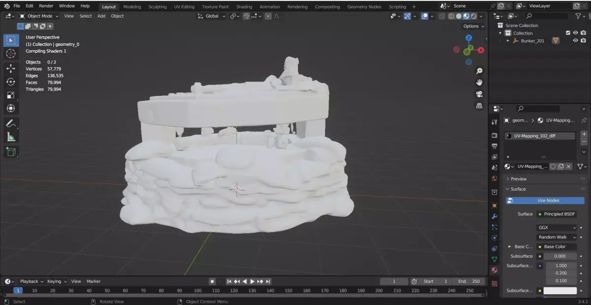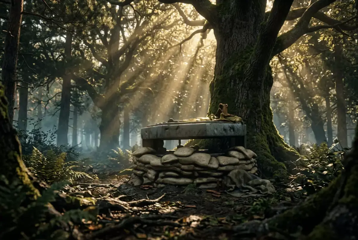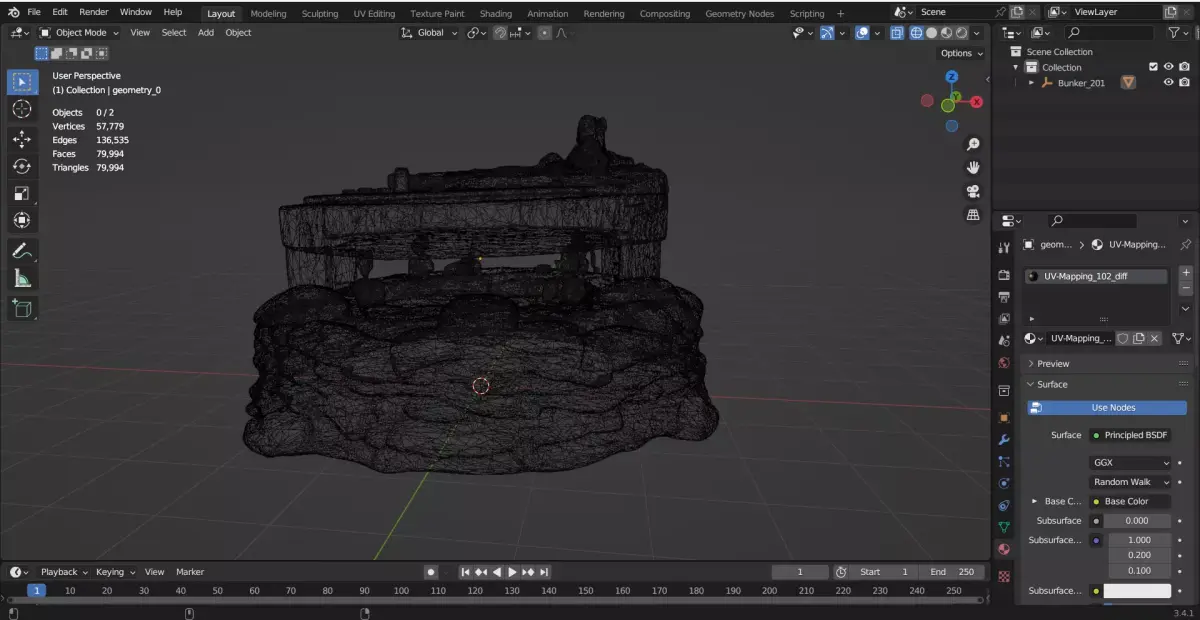 This 3D model features a detailed forest bunker environment designed with realistic PBR textures. The scene includes the bunker structure, surrounding terrain, and natural environmental elements. The model is optimized for multiple 3D workflows and exported in various formats including FBX, OBJ, DAE, and BLEND.