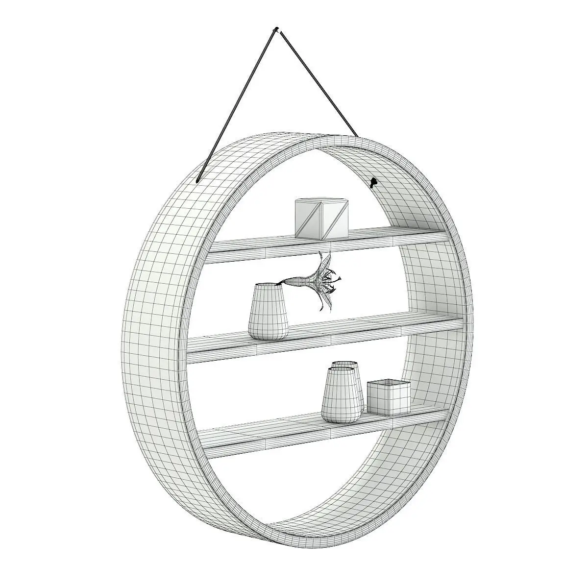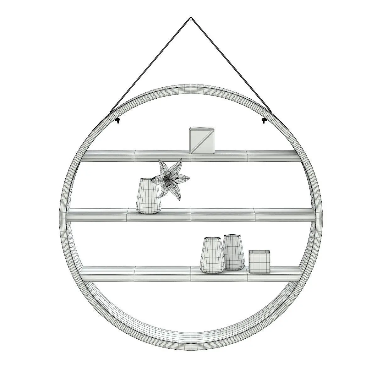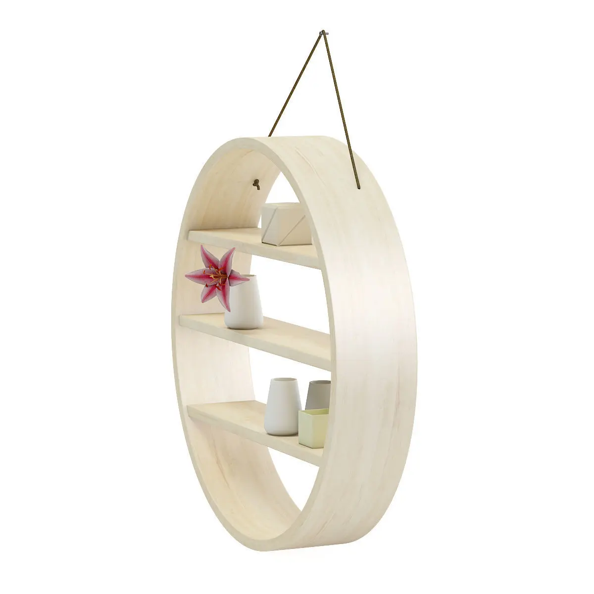 Circle shaped wall shelf 3d model hanging on the brown rope. It has some decoration placed on it: flower in a white vase, some flasks and decorative boxes. Compatible with 3ds max 2010 (V-Ray, Mental Ray, Corona) or higher, Cinema 4D R15 (V-Ray, Advanced Renderer), FBX, OBJ and Unreal Engine.