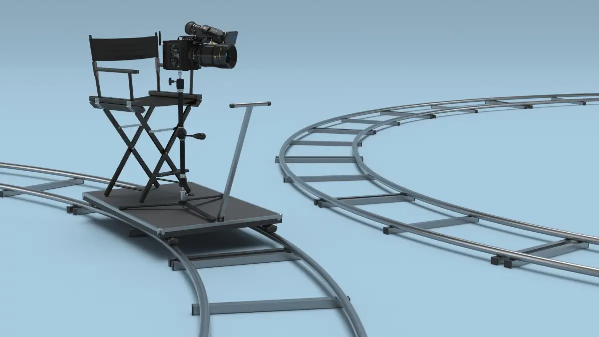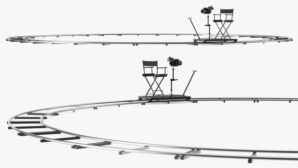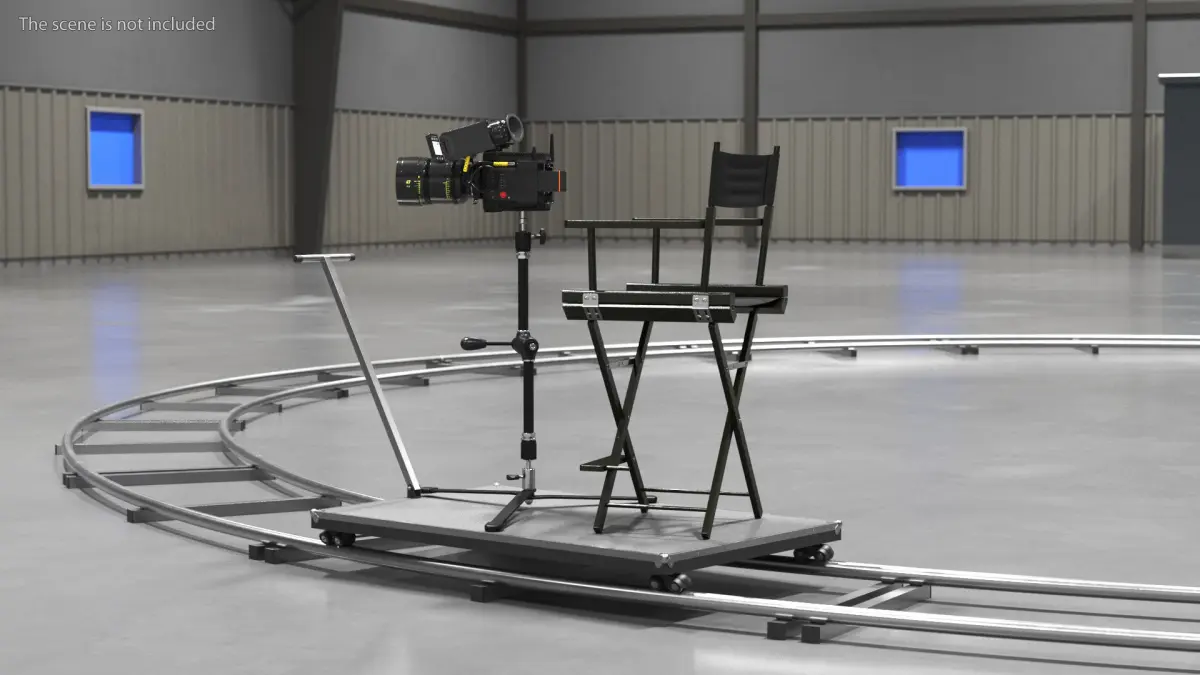 Circular Camera Dolly with Seat and Camcorder is a three-dimensional model of sliding flat dolly with track structure for filmmaking cameras, designed to enable smooth camera motion along a guided rail system.