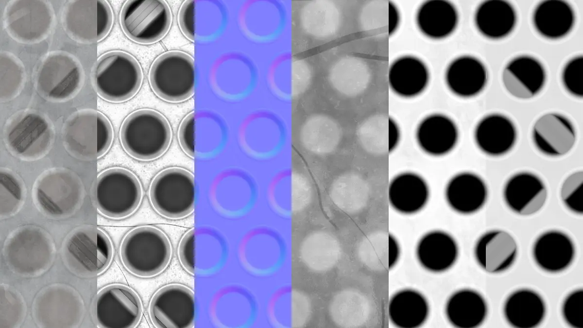 Realistic Circular Pattern Metal Grate Material for use in any kind of industrial, commercial, or construction scenes, renders, or models.