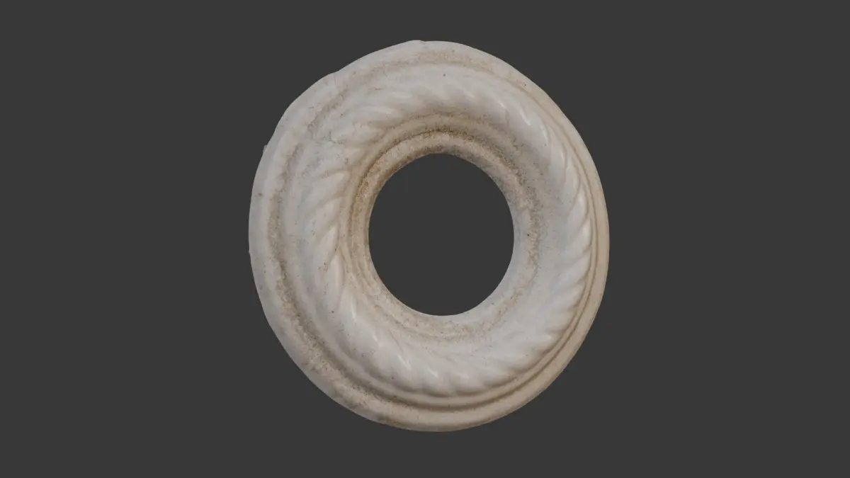 Highly detailed 3D scan of a circular plaster rosette or molding, featuring a central opening and a repeating leaf or rope-like pattern around the edge. Ideal for ceiling light fixtures, architectural embellishments, decorative wall accents, or as a classical prop. The model is provided in multiple formats (BLEND, FBX, OBJ, GLB, USD, STL) and includes 4K PBR textures for seamless integration in any pipeline.