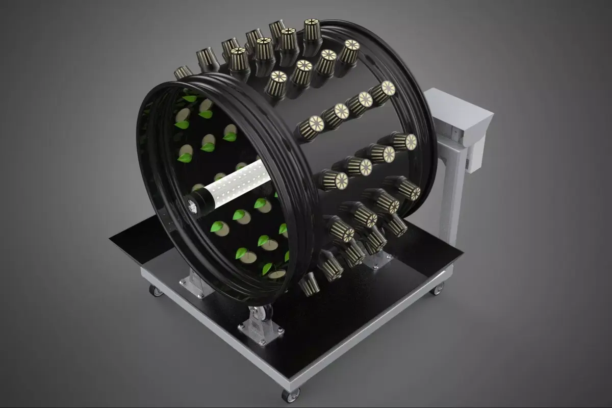 The fundamental operational principle revolves around a central, stationary light source, typically comprising high-intensity discharge (HID) lamps or energy-efficient LED arrays, positioned within the rotational axis of the wheel. Plants are housed in individual growing containers, net pots, or pockets affixed to the perimeter of the rotating wheel. As the wheel slowly rotates, each plant module sequentially passes through a full 360-degree cycle, ensuring uniform and optimized exposure to the central light source. This rotational movement is critical for maximizing light absorption and can influence plant phototropism positively.