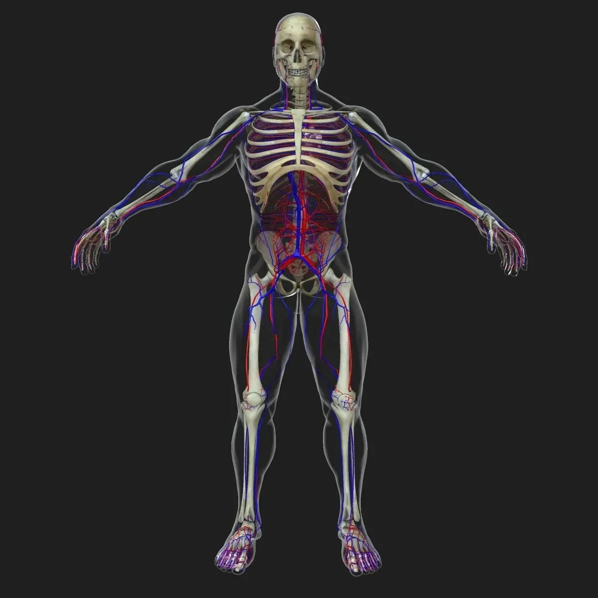 ==FEATURES==-Very detailed circulatory system including veins, arteries and heart.-X-Ray Shader for the Skin (Ready to render exactly as shown)-Each bone is select-able and named / grouped properly for easy organization-Real World Scale (6 feet 2 inches, 1.89 meters, 74.6 inches)-Displacement map for extreme detail-Clean edge-loop based topology-Light set up ready to Render-Maya 2015+ compatible
