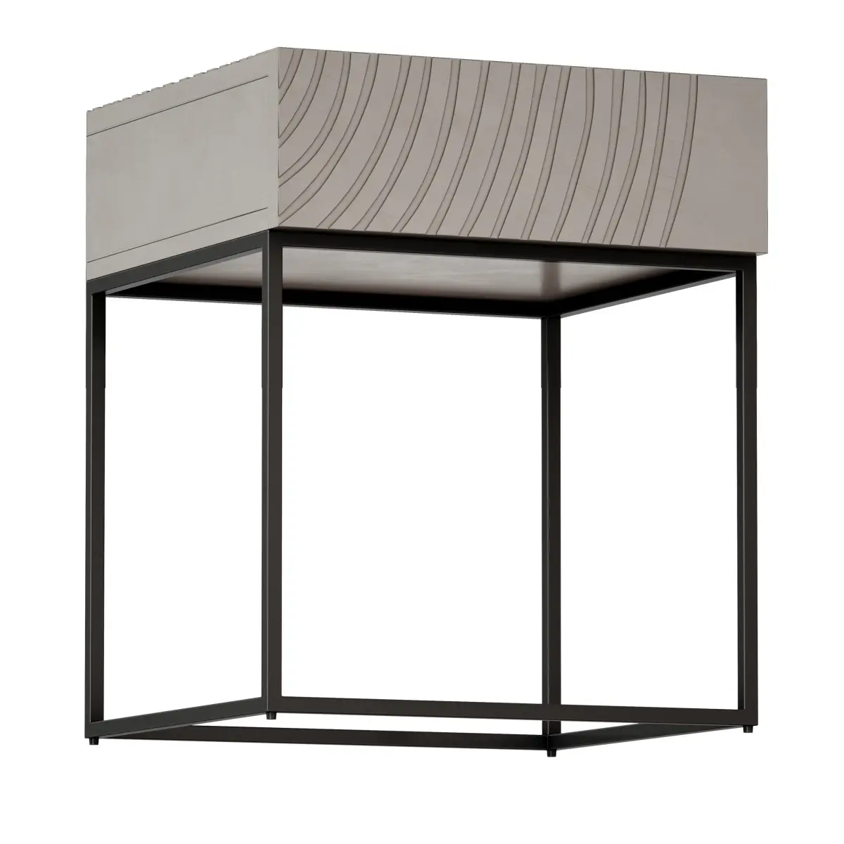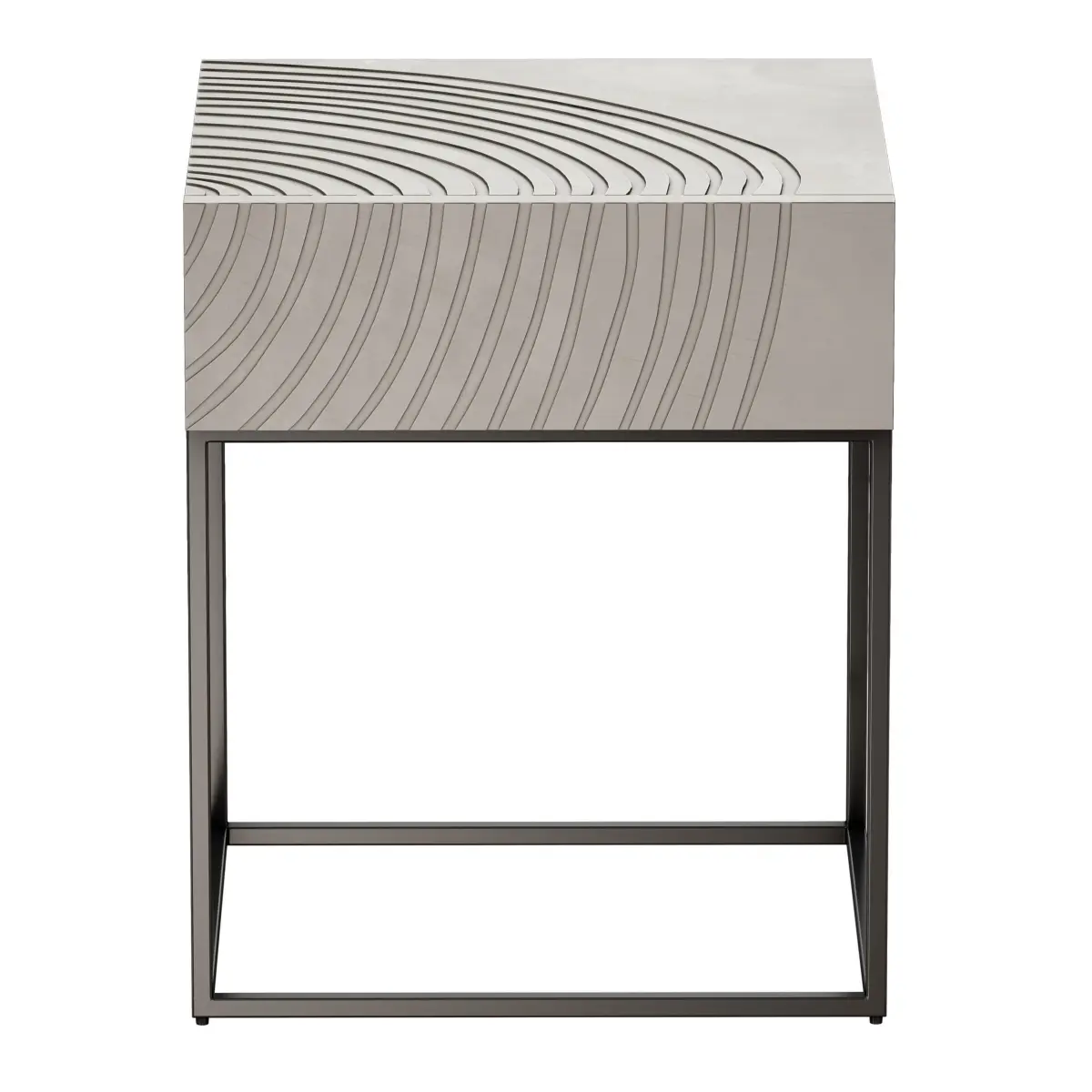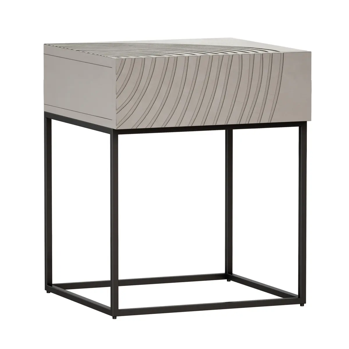 Light wood bedside table with black metal frame. A radial pattern is made on the upper and front parts.