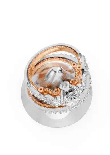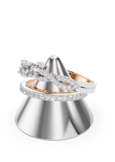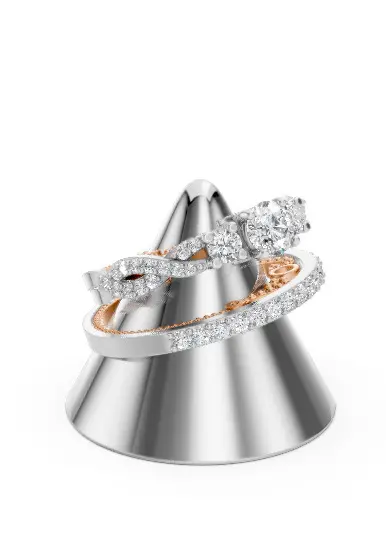 This sophisticated two-tone ring set features a stunning combination of white and rose gold aesthetics, enhanced by intricate pavé-set diamonds. The graceful braided design on the engagement ring adds vintage charm, while the matching band provides a bold sparkle with round-cut stones all around.Perfectly suited for engagement or bridal jewelry collections.
