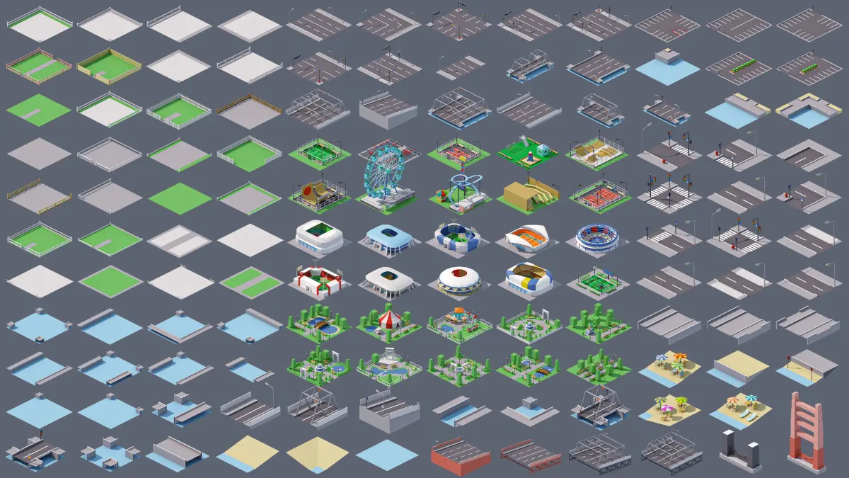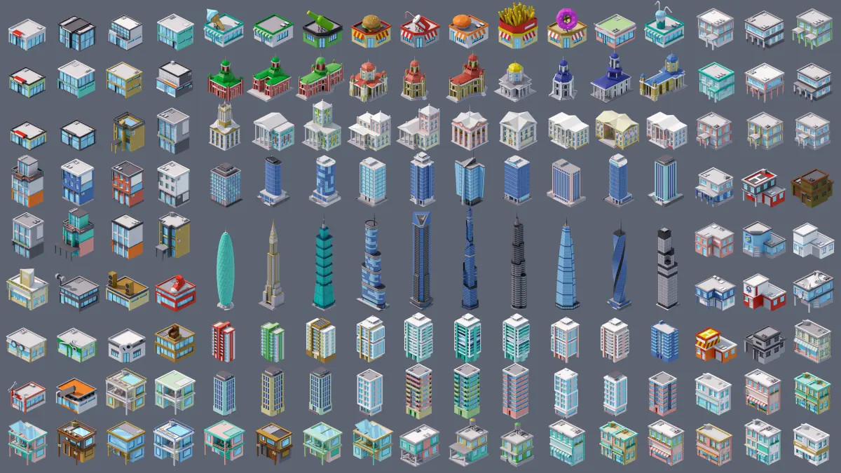 - Buildings (x150): Small houses, cottages, banks, hotels, cafes, supermarkets, service stores, art buildings, temples, middle-size houses, high-rise buildings, business centers, skyscrapers.