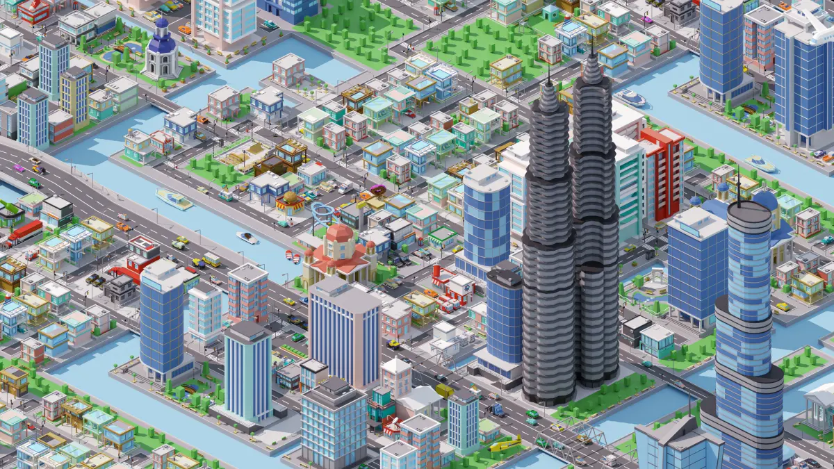 City 2 is a package of low-polygon 3D models optimized for game engines. It includes 430 assets such as landscapes, buildings, stadiums, and transportation.