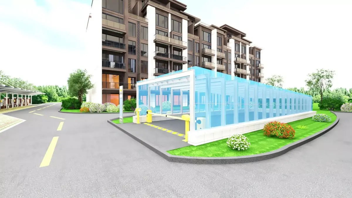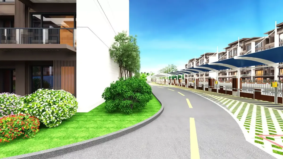 Exterior scene of a city block with street elements and parking for cars and bikes with electric chargers. Decorated with various outdoor plants.