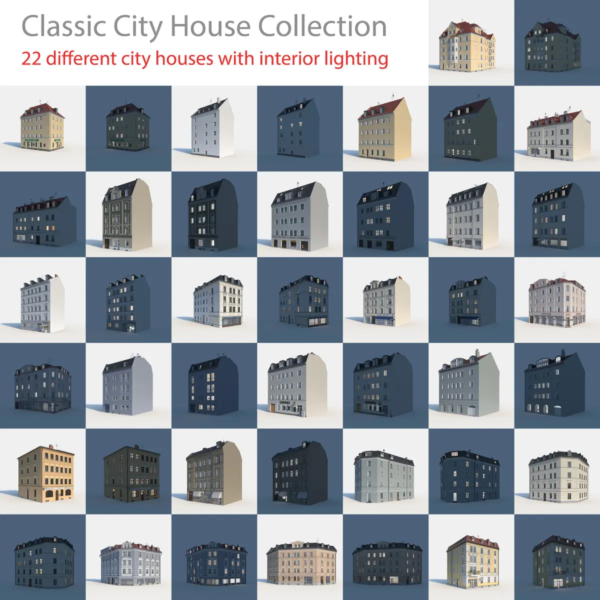 22 High Quality Classic City Buildings, in the style of 19th and early 20th century for modern use with many details, suitable for far, medium and closeup shots. Modern equipment like satellite dishes, antennas and windows.Great for renderings to accompany architectural visualisations as exterior side buildings and background buildings, backgrounds for indoor archviz renderings, product renderings, visual effects, and to let whole citys come to life!