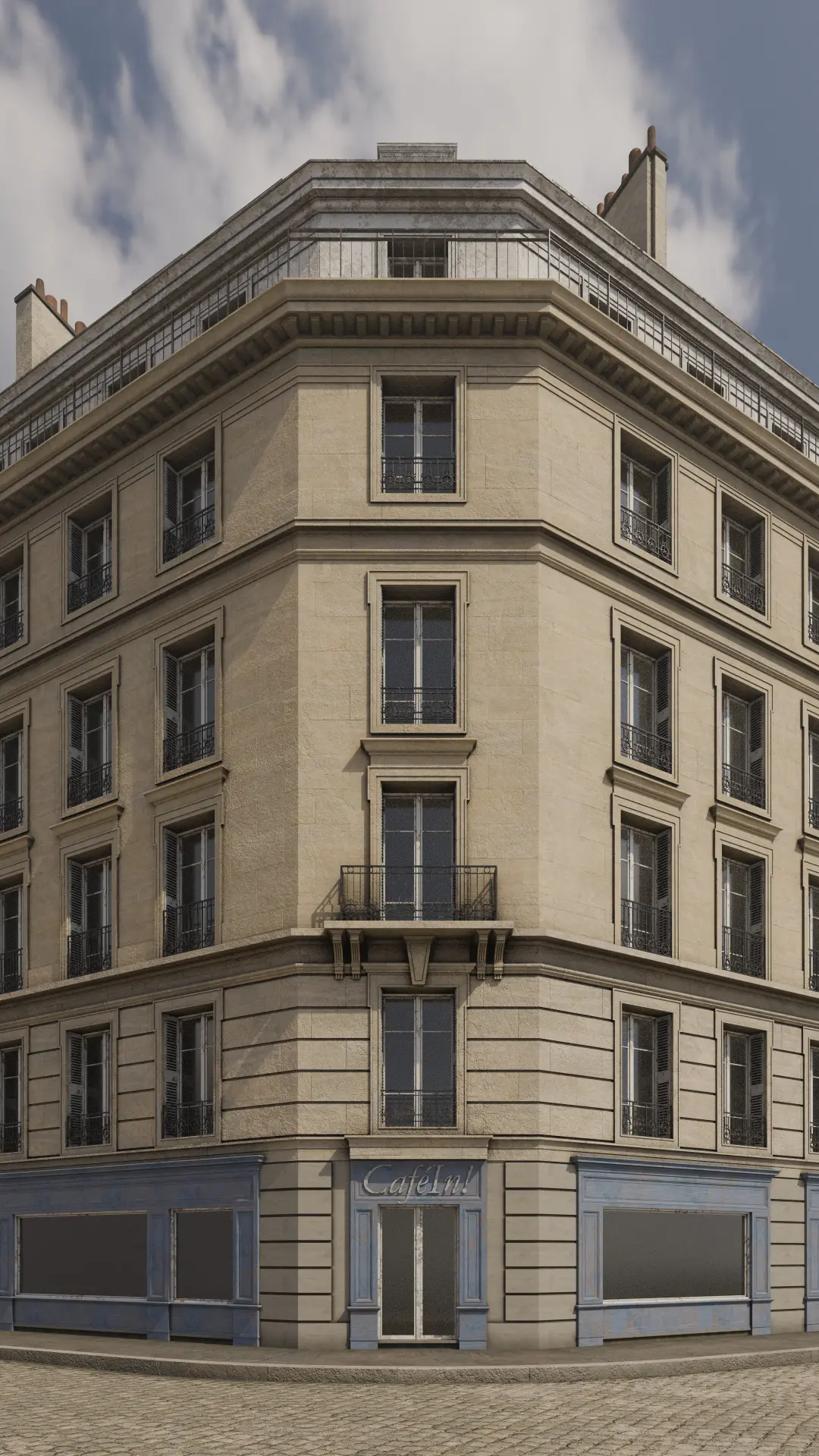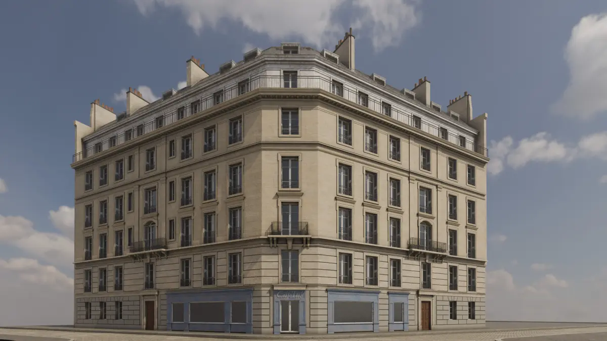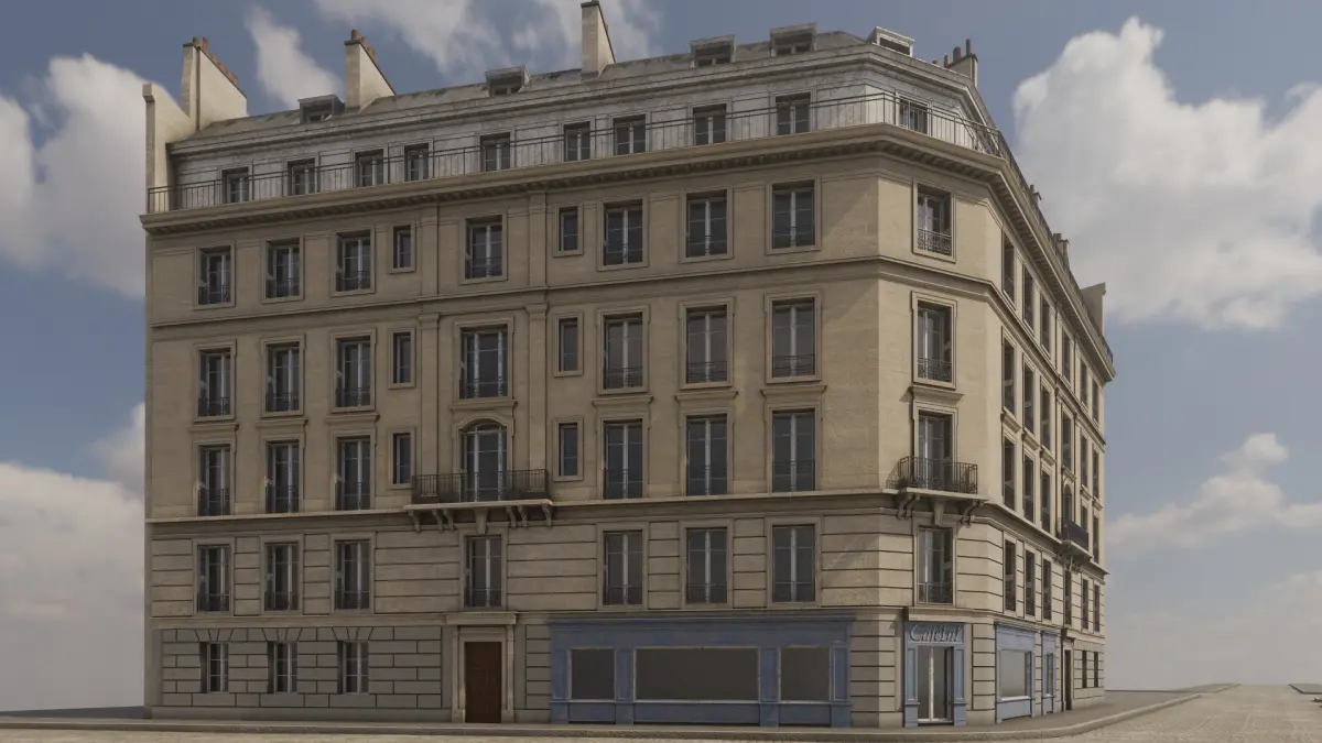 Detailed model of a parisian building. Suitable for high resolution close-ups. Real world scale. Cameras are placed at eye level (~1.65m / 5'5''), scale figurines are 1.80m / 5'11'' in height.
