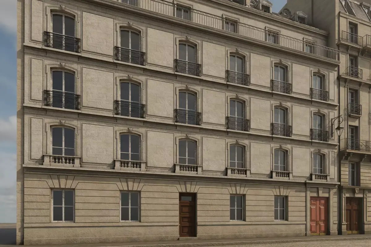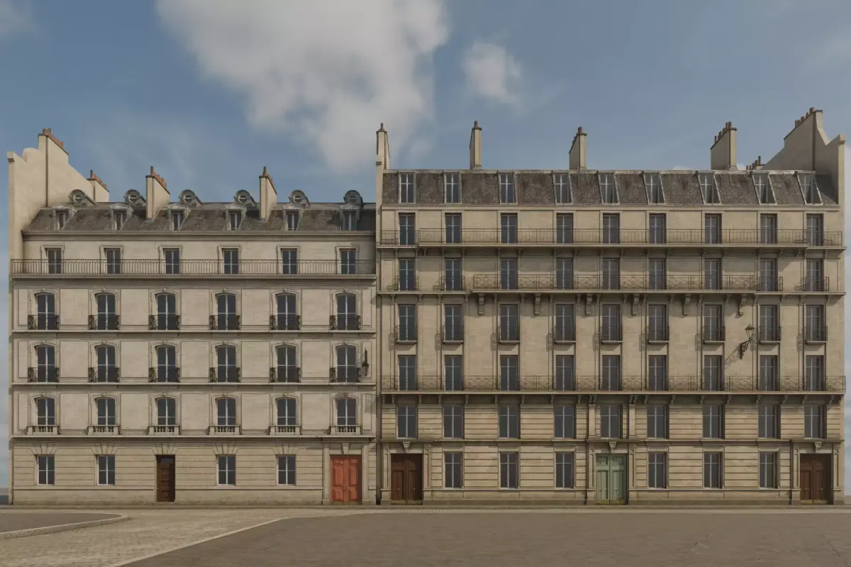 Detailed model of two classical urban buildings. Suitable for high resolution close-ups. Real world scale. Cameras are placed at eye level (~1.65m / 5'5''). Scale figurines are 1.80m / 5'11'' in height.