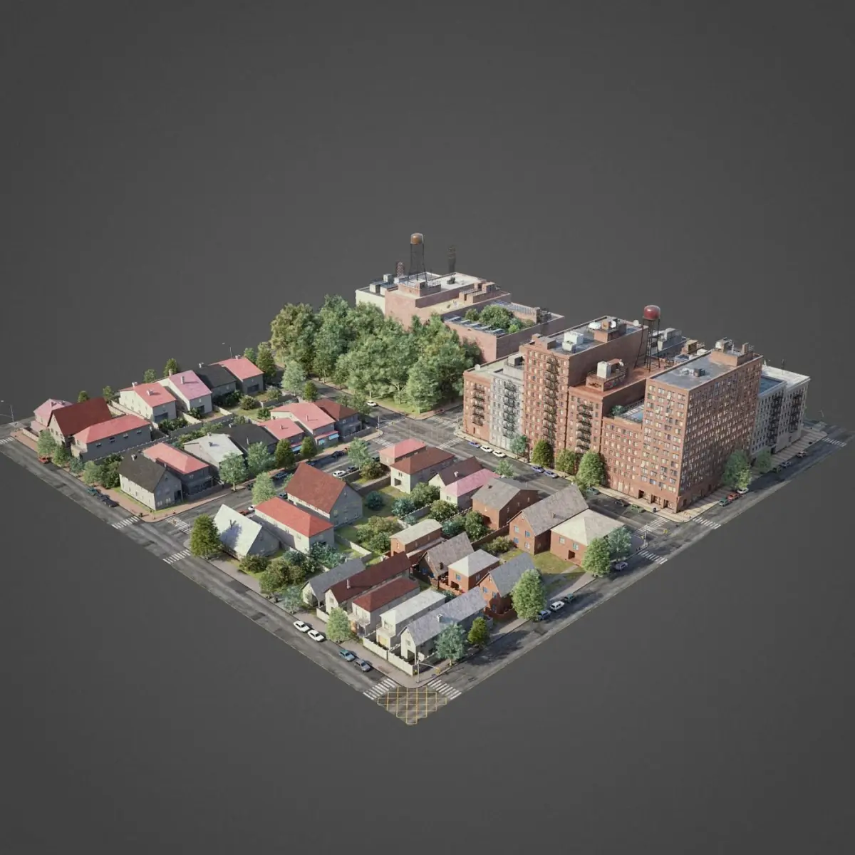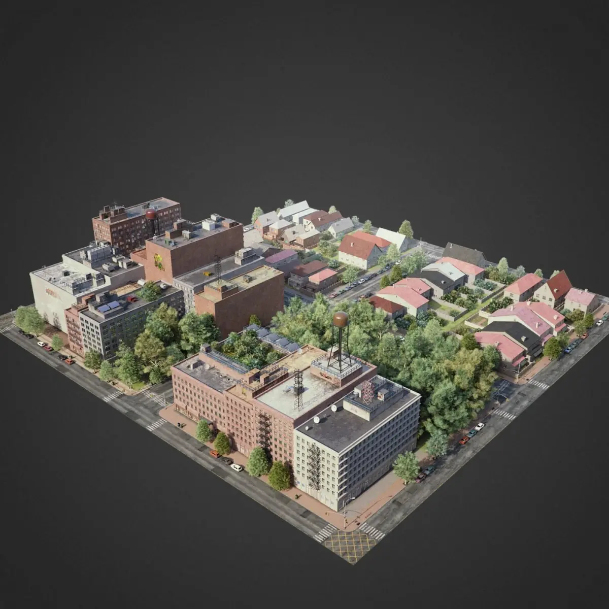 This is full 3d city model modeled based on americans cities. This is real world scale model. Whole scene setuped and fully ready to render. All materials setuped in Vray. Light setuped by HDRI and Dome light.