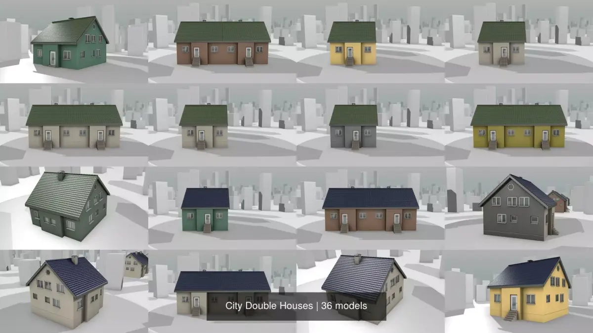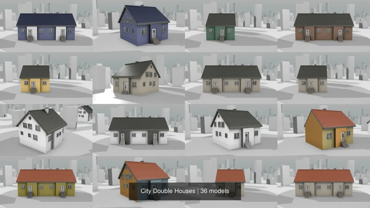 Modelliert und texturiert in Blender-3D (https://www.blender.org/)Here are 36 single and two family houses with different colors for the roof and the walls.