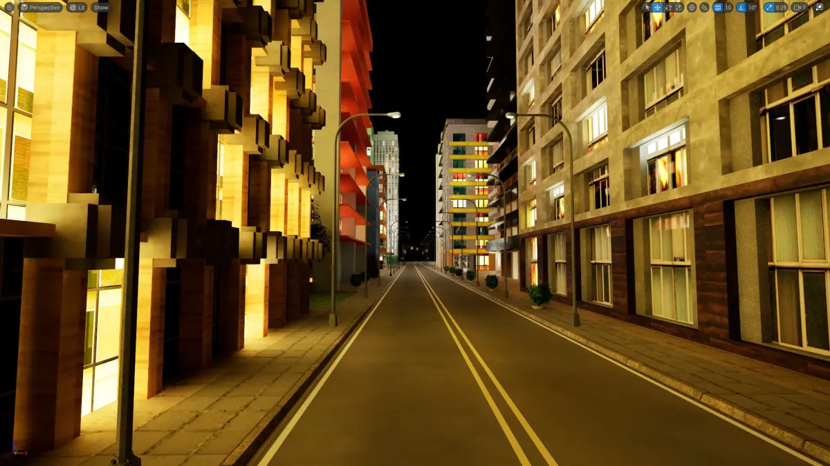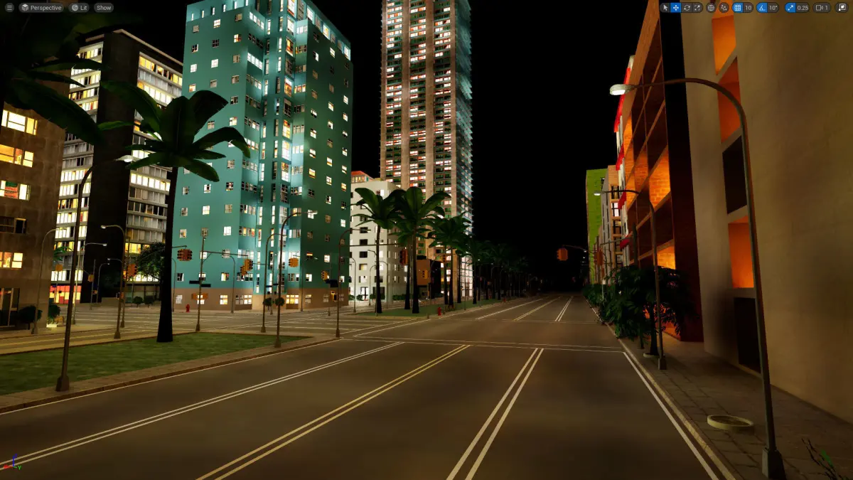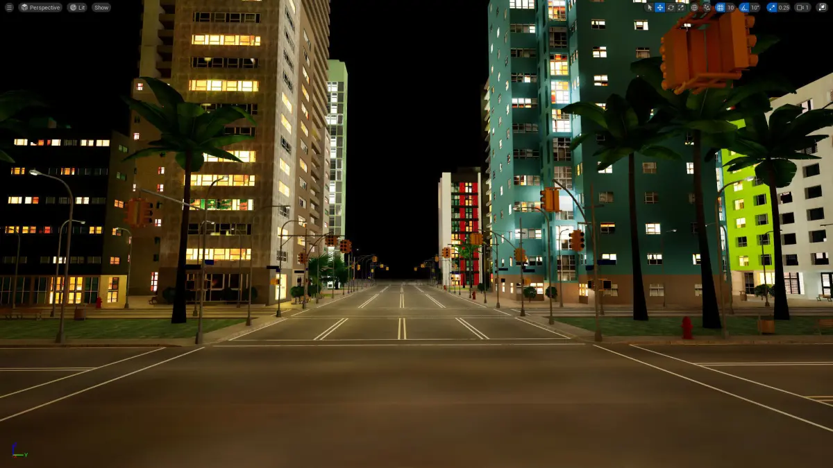 Night Version - Game ready Unreal engine project file of a city block. Great for first person, open world games, and VR. Also included is the glb and Blender files, with the textures packed. The textures include colour maps, and spec maps for the windows. The footpaths include normals maps. The trees include transparency maps for the leaves. Assets are low-poly trees, roads, traffic lights, rooftop HVAC plant, buildings, fire hydrants, parks, park benches, and etc.