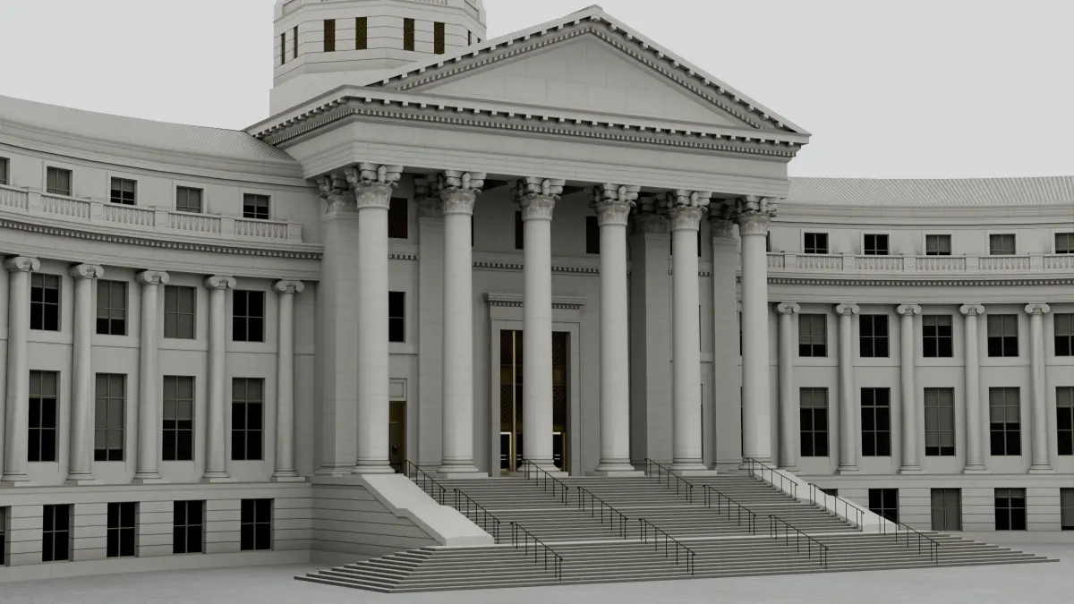 The building's neoclassical style reflects Denver's aspirations to be the Rome of the Rockies. The stone edifice has a symmetrical H plan, measuring 133 meters wide and 84 meters deep, but it is only 27 meters high to preserve Denver's cherished mountain view. The grand entrance features a massive pedimented portico with six 15-meter Corinthian columns. The most striking feature of the City and County Building is the two four-story wings, fronted by Ionic columns, which extend forward from the central structure.