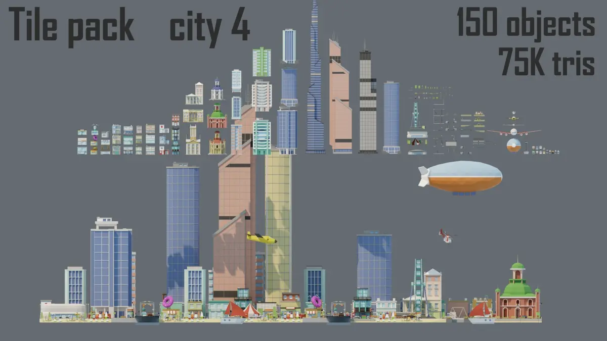 The package has all the components to create any city! Used for games, rendering, advertising.