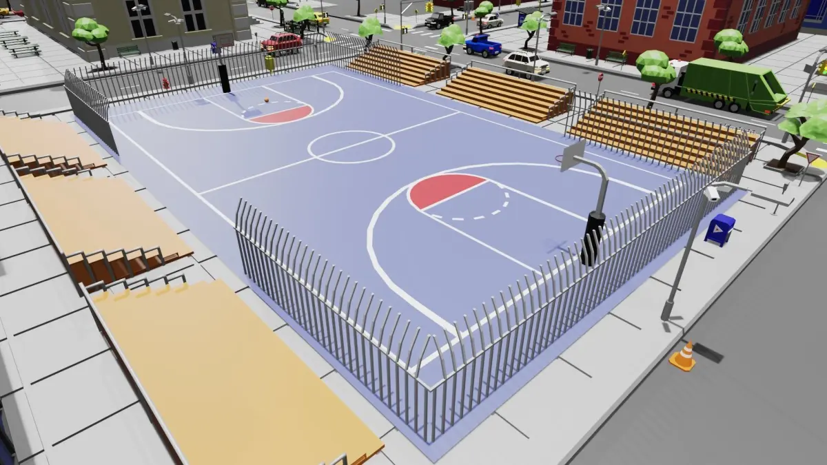 -basketball court and basketball, soccer court and soccer ball, bleachers