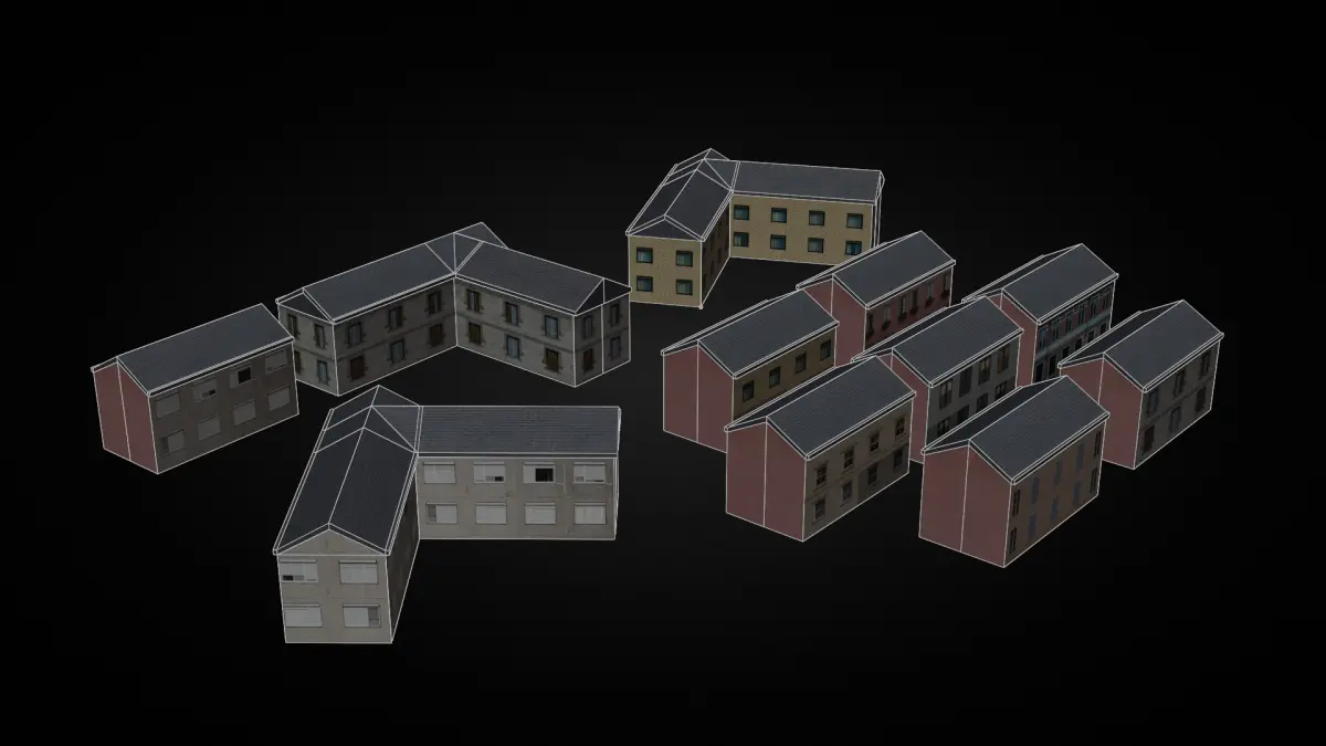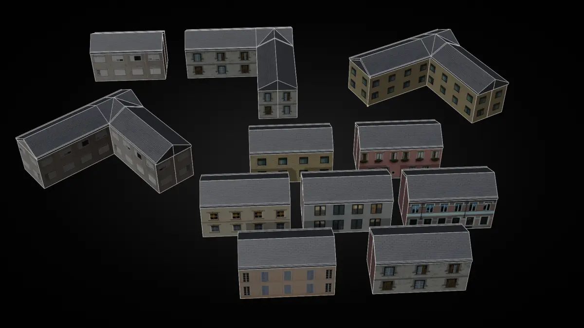 6 different small and medium-sized buildingsApartment and small commercial building designsVarious roof types (L-shaped, flat, sloped)Technical Details:Formats: FBX, OBJ, STLTexture Resolution: 1024x1024 - 2048x2048 (PBR supported)Size: Optimized for low MB usagePolygons: Low-poly, suitable for mobile and PC gamesUsage: City simulations, open-world games, racing games