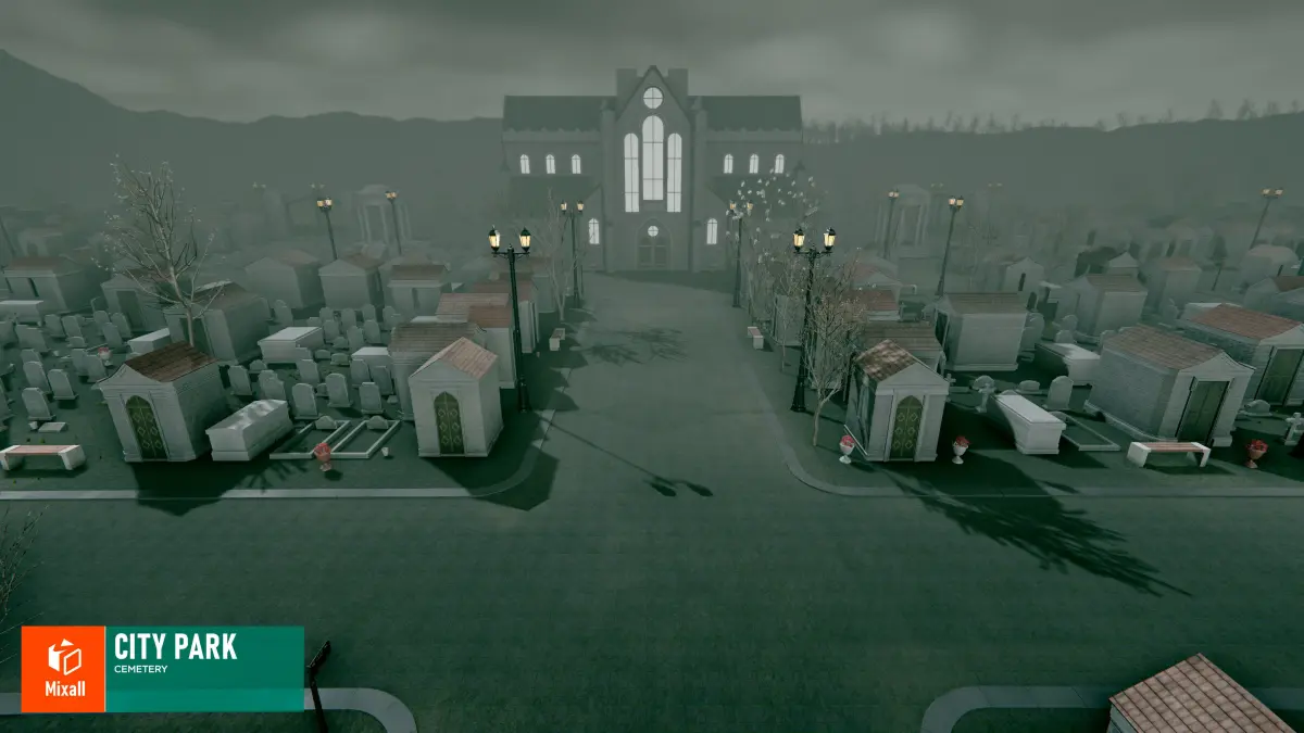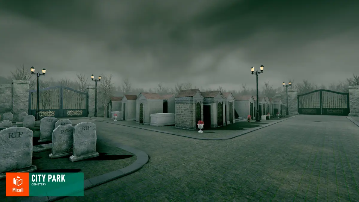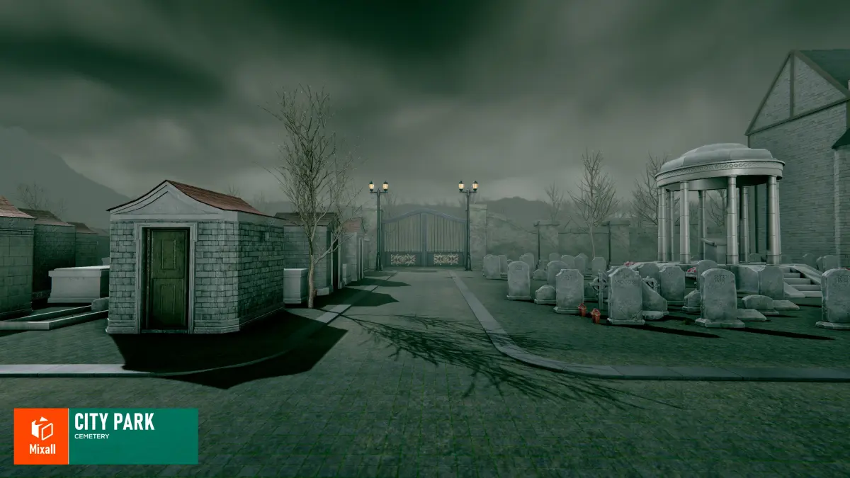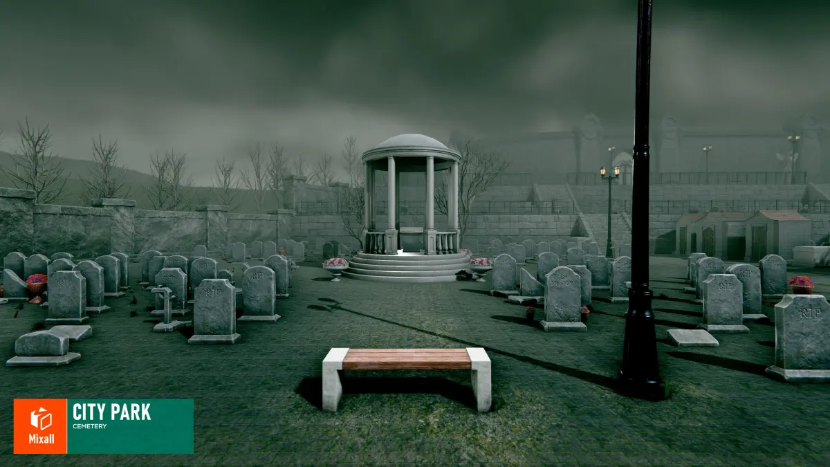 Mixall studio presents a good solution for your games, VR projects and simulators: City park - cemetery.Most assets have 2 Texture sets to apply to your materials (Normal and Moss). Every asset is modular, to be used in VR and traditional views.