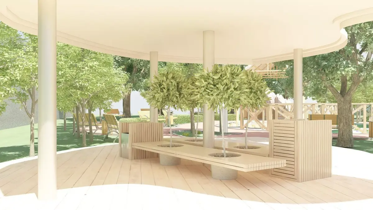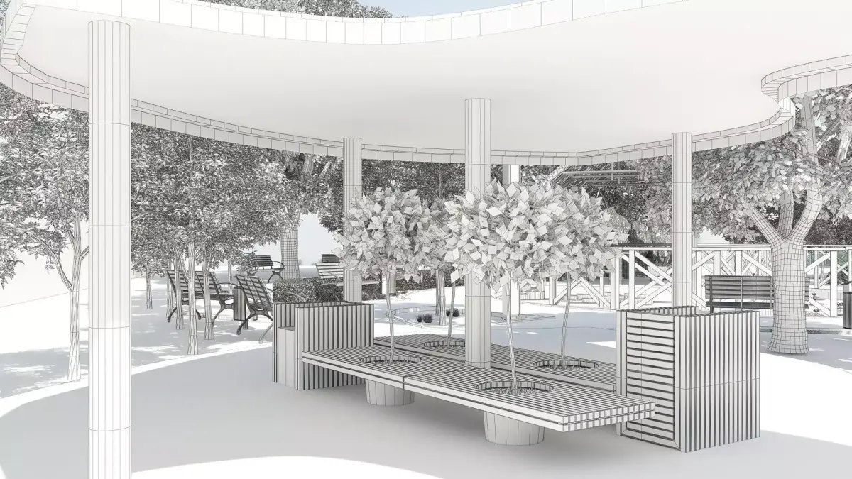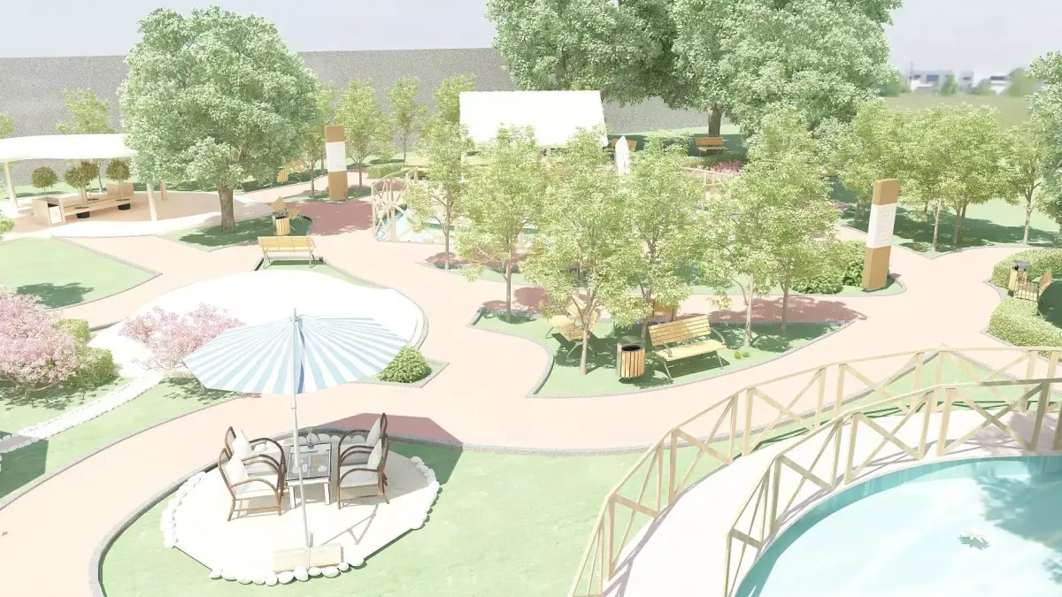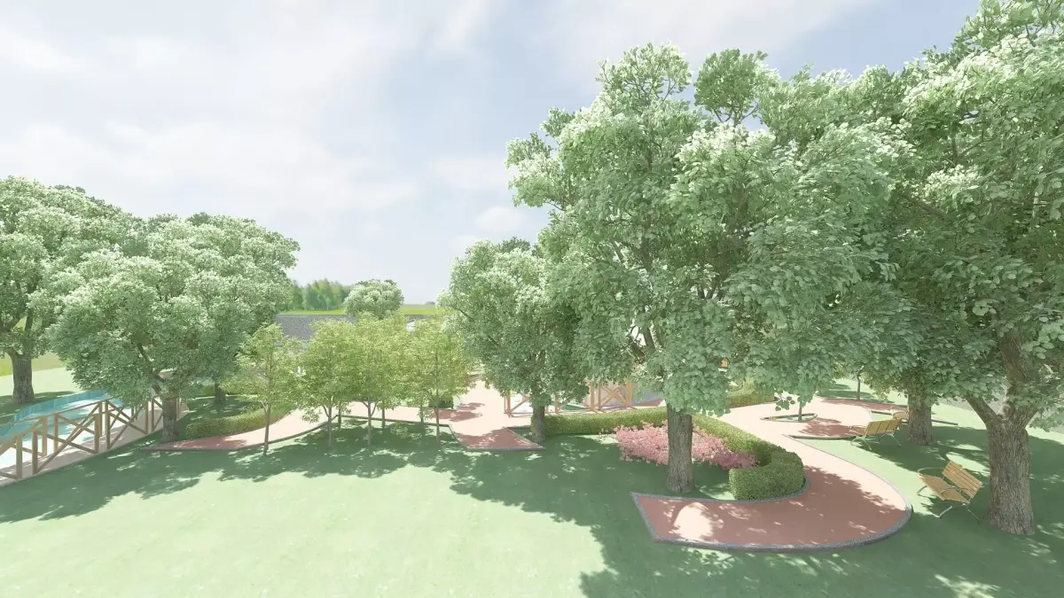 City park concept. Water pond, sheltered benches, tennis court, trees, bushes, flowers.Various decorative items.