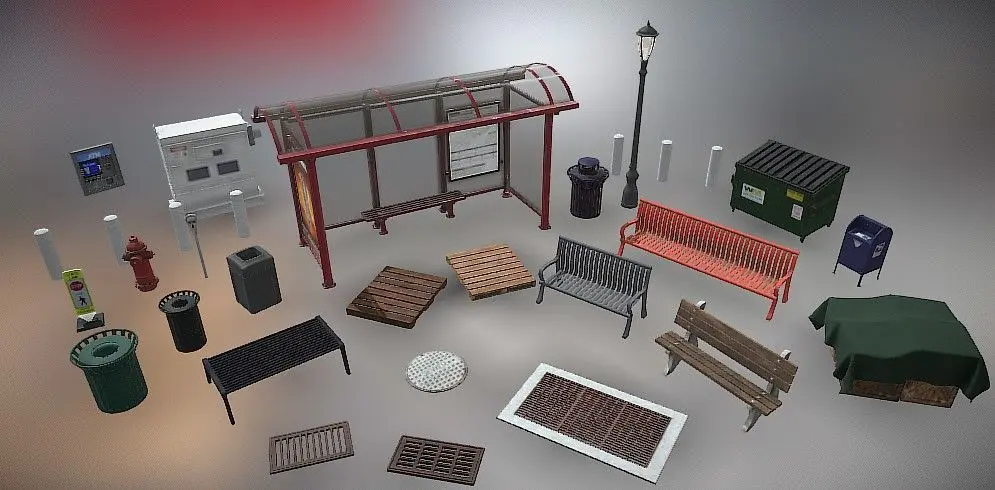 Make sure you also check out my new City Props Collection volume 2Some models have multipule material options including the bus stop, benches, pallets, crates.