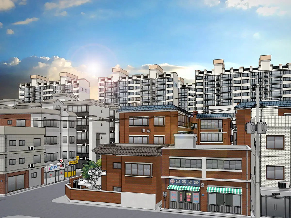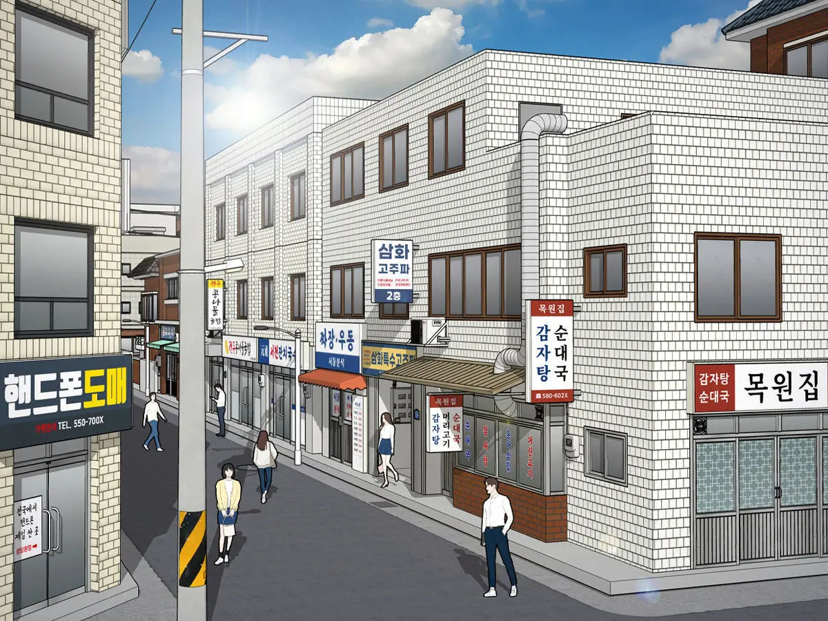It is a cityscape that can be used for animations or webtoons.It consists of restaurants, cafes, bookstores, and Korean-style houses. Various productions are possible for animation. Extra characters are included.