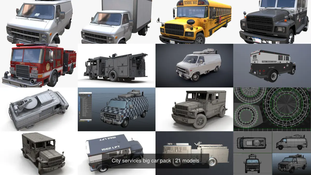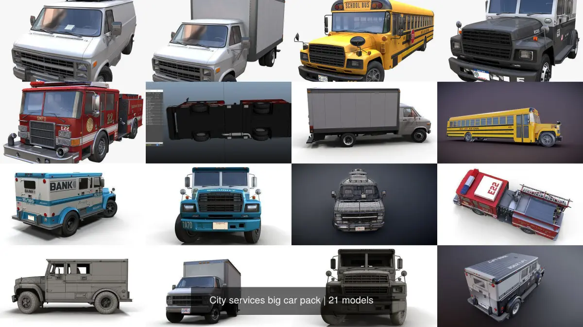 This collection includes police cars, taxi, vans, box truck, fire engine, garbage truck, food trucks, school buses, sedan, TV van.Models ready for real-time apps, games, virtual reality and augmented reality.Asset looks accuracy and realistic and become a good part of your project.
