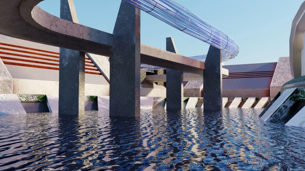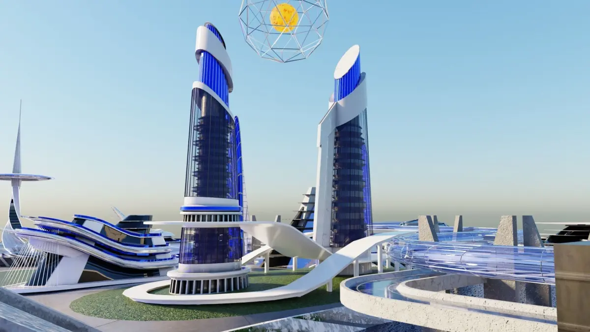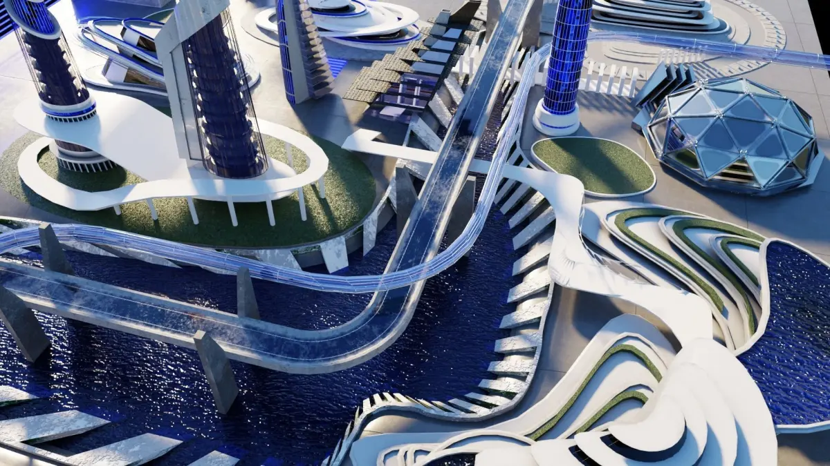 The futuristic city that includes 11 main buildings and other elements. such as roads, reservoirs, terrain features, etc.